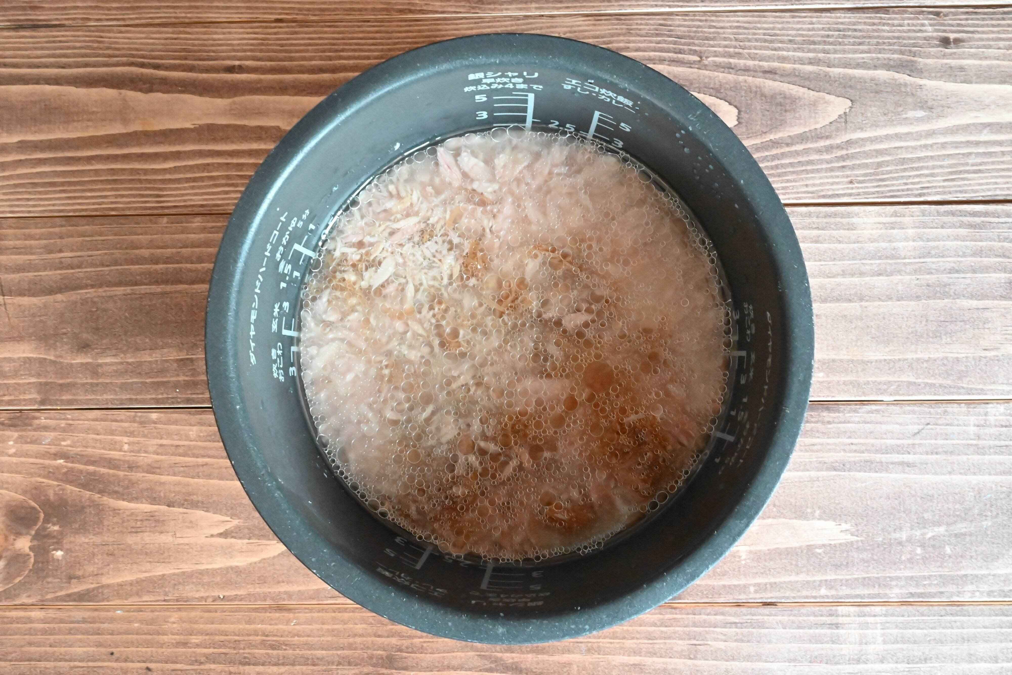 (2)油をきったツナ缶、なめたけを広げ入れ、通常炊飯する。