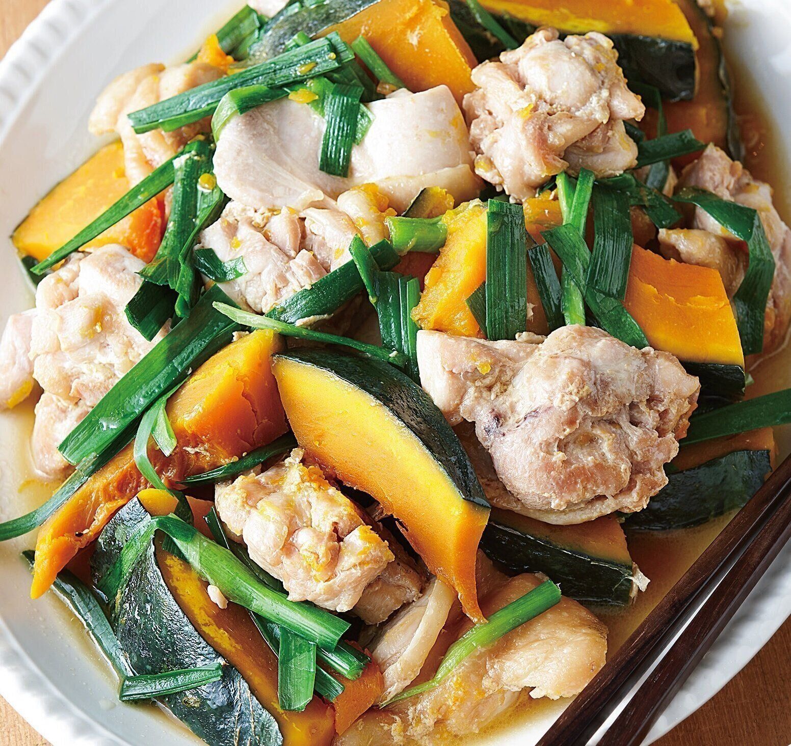 「鶏肉とかぼちゃのバターじょうゆ蒸し」は、4人前でニラを1束使い切ることができるレシピです。具材は蒸し焼きにするため、生のニラはもちろん、冷凍にしておいたニラも解凍なしで使えます。