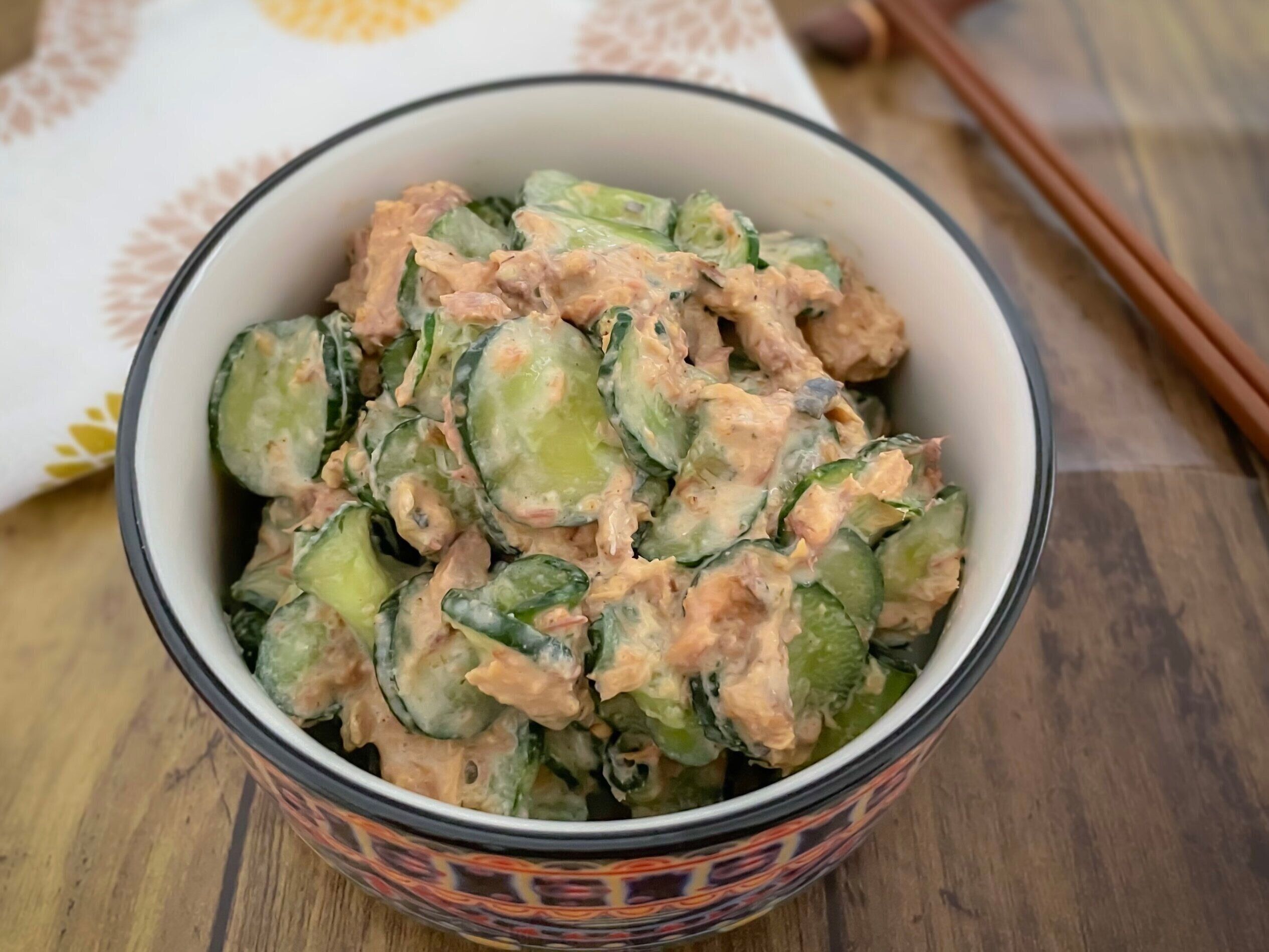 きゅうりを大量消費したいなら、「きゅうりと鯖のごま味噌マヨ和え」を作ってみましょう。ストック食品の鯖缶とたっぷりのきゅうりを使うことで、切って和えるだけで火を使わずに5分程度で完成します。鯖の旨みとマヨネーズのコクが、ご飯にもお酒にも合います。