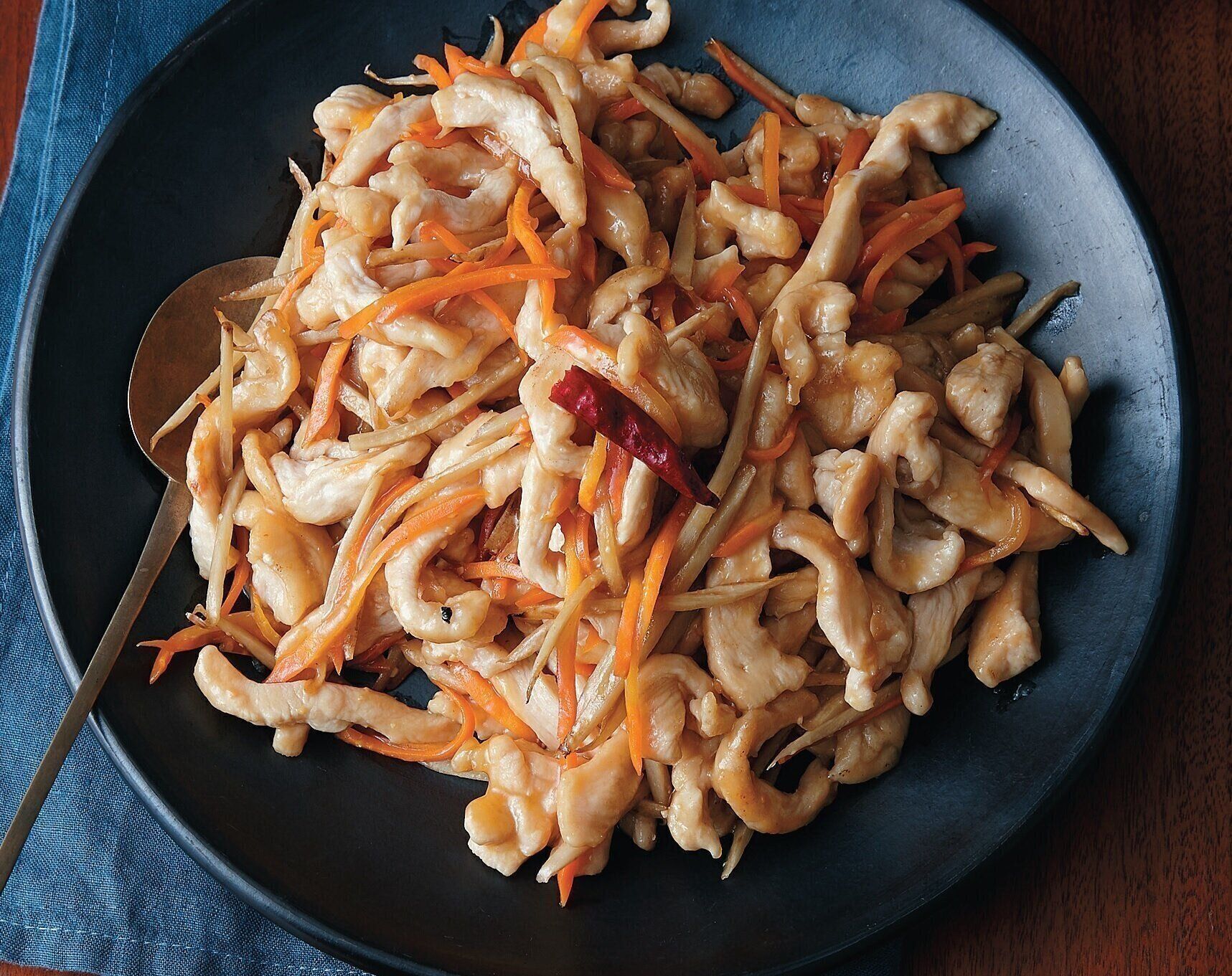 「細切り鶏ごぼう炒め」は、鶏むね肉とごぼう、にんじんを使ったメインのおかずにちょうどいい炒め物です。にんじんのオレンジ色とアクセントとなる唐辛子の赤色が料理に彩りを添えています。