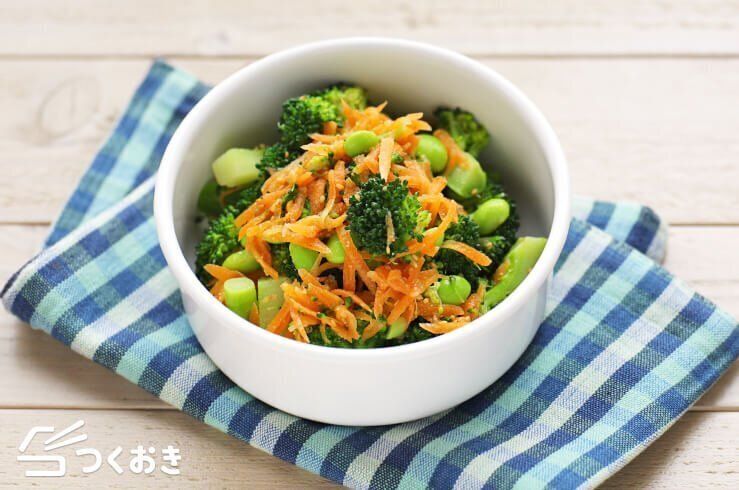 枝豆をにんじんやブロッコリーと和えれば、見た目も美しく、栄養もたっぷりのサラダが完成します。ブロッコリーに絡んだごまと枝豆の歯ごたえがクセになるサラダです。