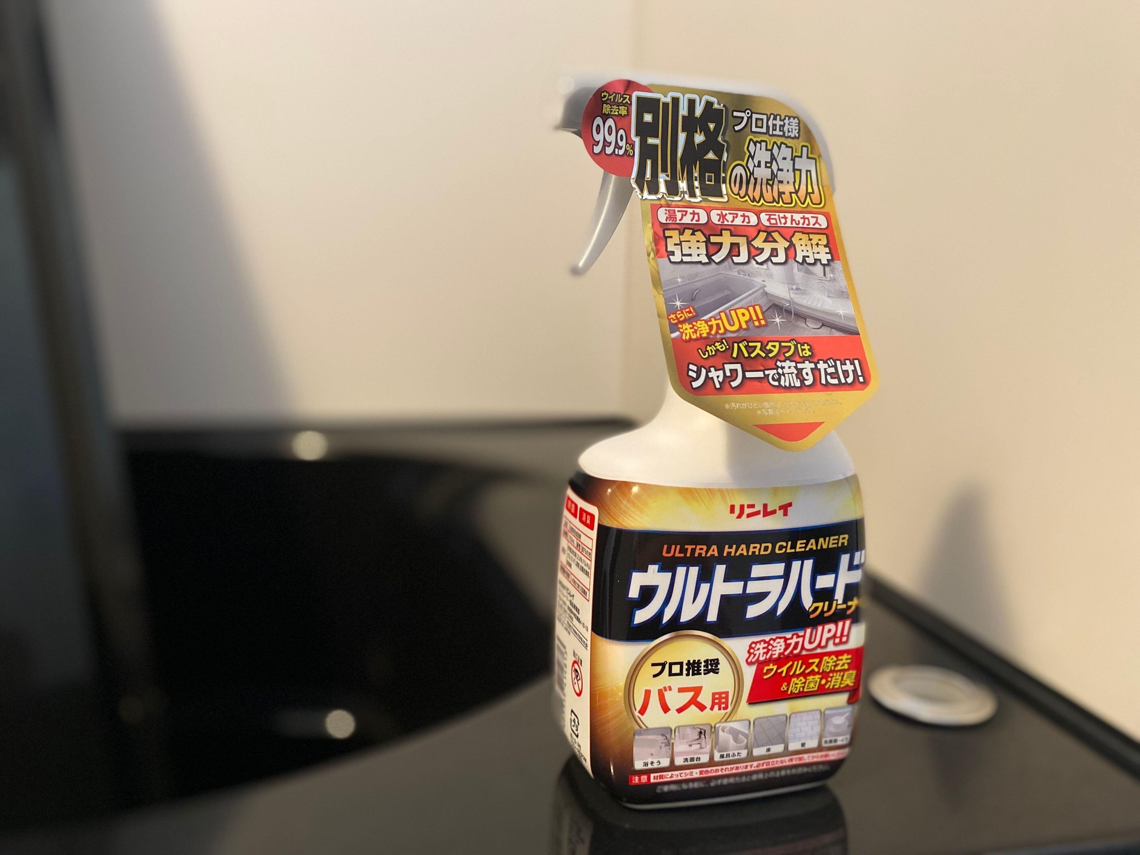 筆者が使っているのは「リンレイウルトラハードクリーナーバス用」。浴室内の床、壁、鏡、イス、浴槽、あらゆるところに使用できる洗剤で、特に浴槽はスプレーして60秒ほどおいてすすぎ洗いをするだけで擦らずにピカピカと輝くようにキレイになります。