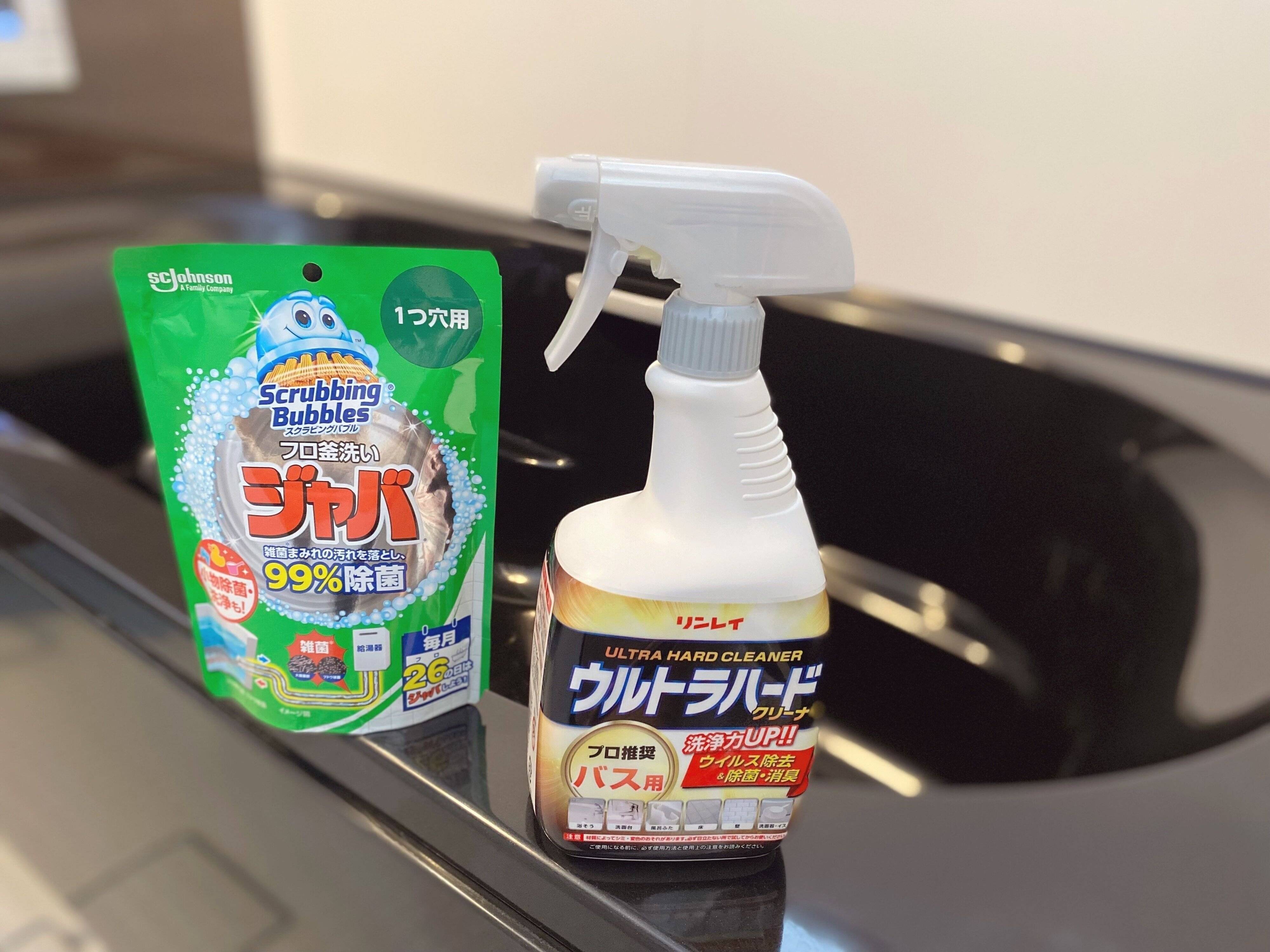 普段お風呂用の中性洗剤を使ってお掃除をしていても、白いウロコ汚れやザラザラ汚れ、黒ずみなどがスッキリ落ちていないと感じるときは、月に1回洗浄力のある洗剤を使って洗浄します。