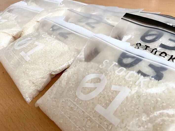 双子の女の子と3歳の男の子を子育て中のワーママ、サンキュ!STYLEライターのkaehalonさん。お米を研がなくていいように無洗米を使っています。買ってきた無洗米はすぐに、毎日使う量に小分けにして保存袋で冷蔵庫へ。平日の計量の手間を省きます。ここまでしておけば、お釜にお米と水を入れて炊飯器のスイッチを押すだけなので、子どもたちのお手伝いにできるのです!平日は、ママはおかずづくりに専念。お米を買ったときだけひと手間をかければ、平日の時短家事につながります。