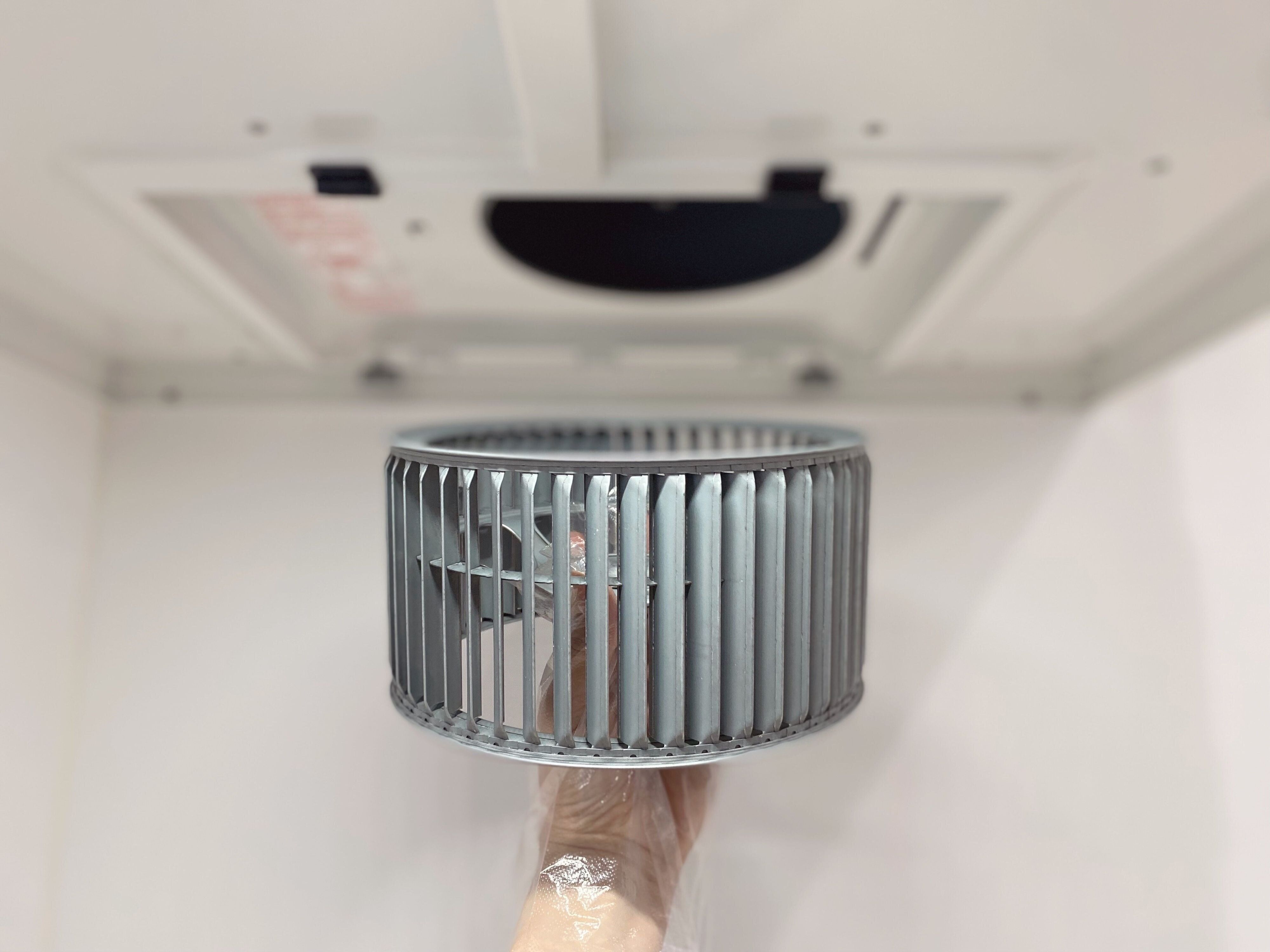 レンジフードの本体カバーをあけ、純正フィルターやシロッコファンを取り外します。