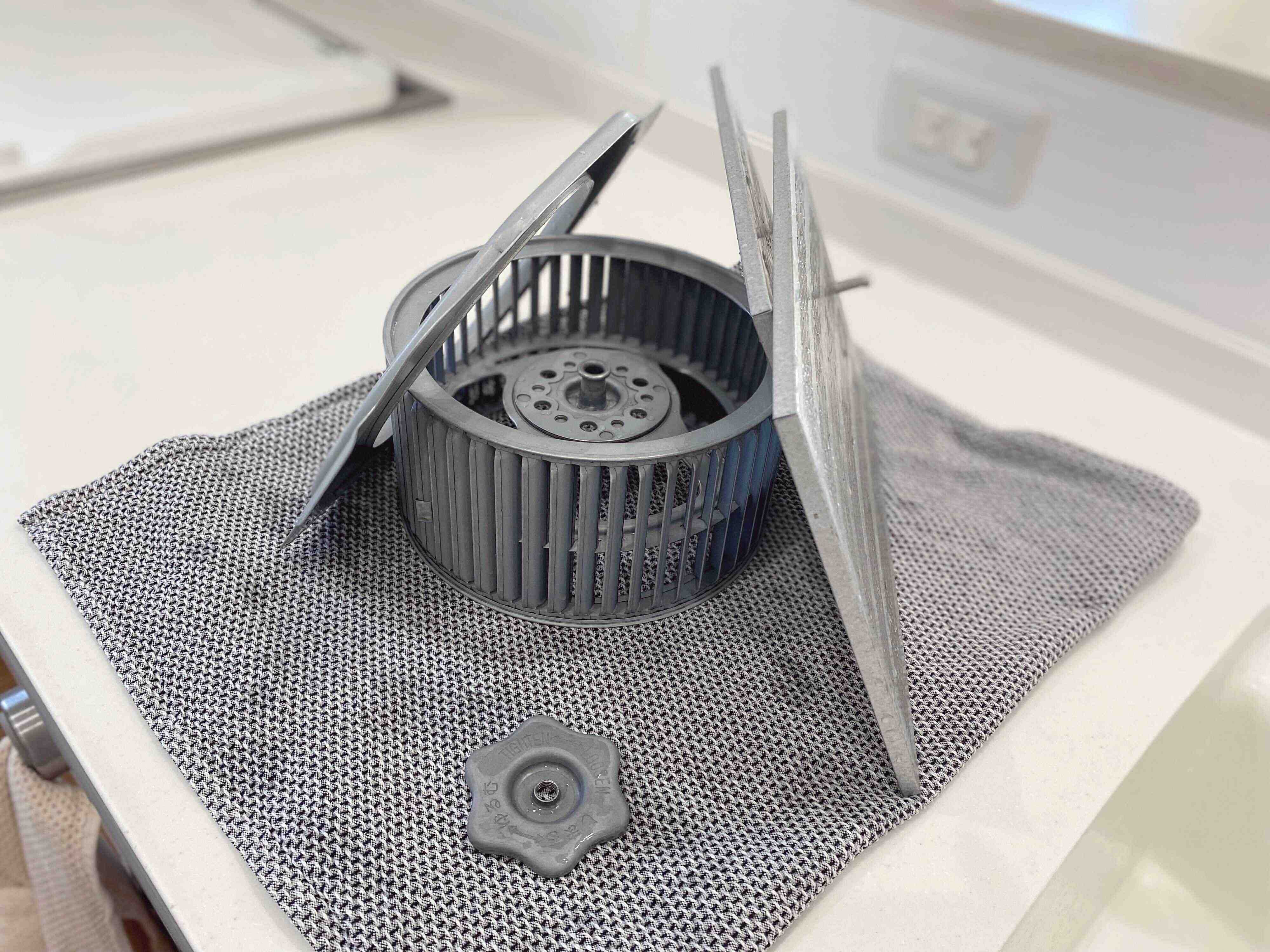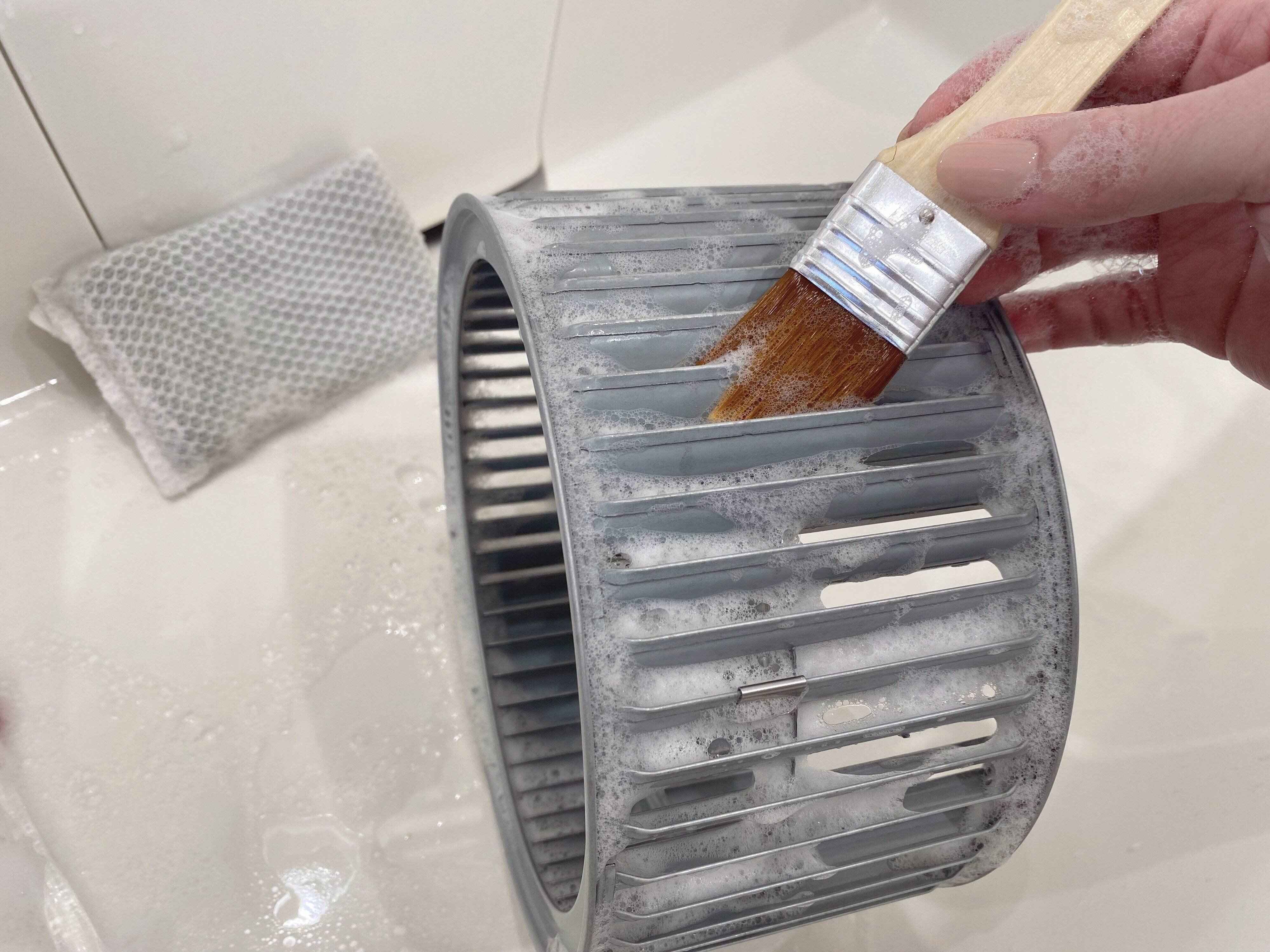 シロッコファンの細長い羽根についた油汚れは、歯ブラシやハケで洗います。