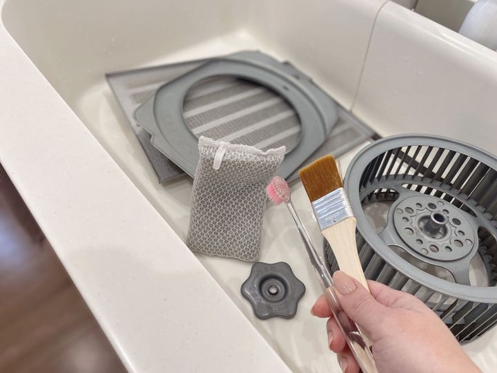 油汚れは放置すると固まってしまい、頑固な汚れになってしまうので、市販フィルターをつけずに本体カバーは1週間に1回、ファンなどの各パーツは1カ月に1回程度を目安にこまめにお手入れすることで、清潔に保つことができるのです。