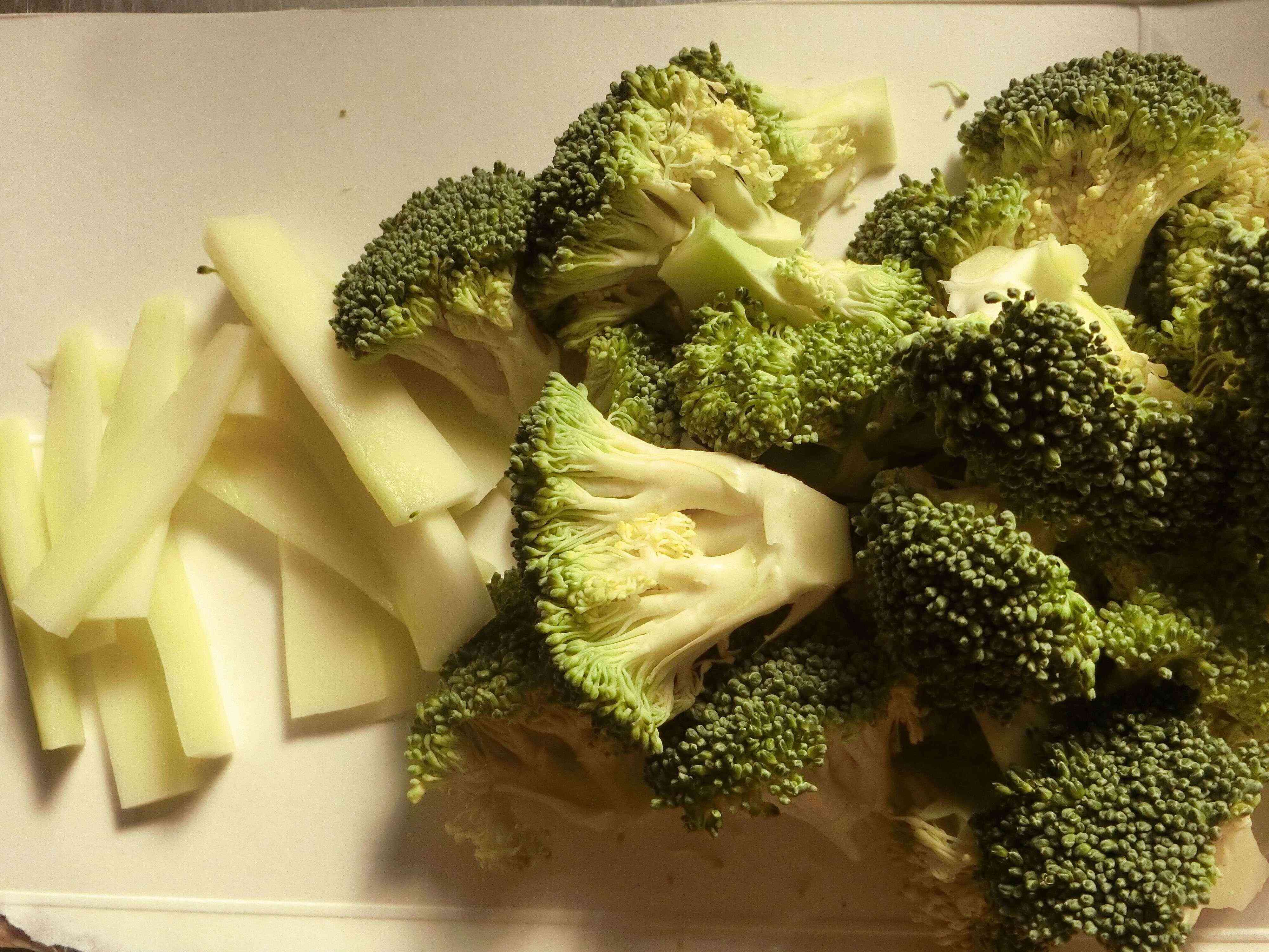 【1】ブロッコリーは子房に分け、茎の部分は厚めに皮をむいて薄切りにします。