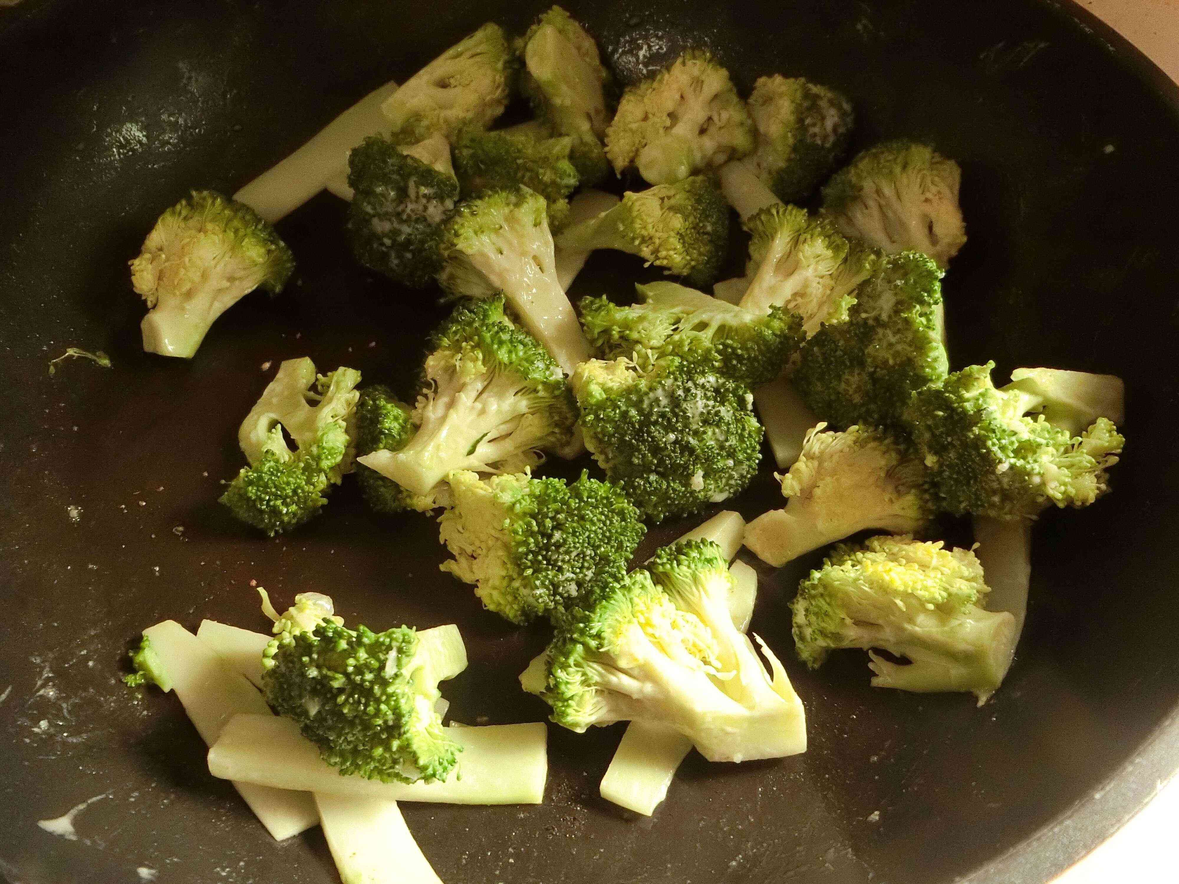 【2】フライパンにマヨネーズとにんにくのすりおろしを入れ、マヨネーズがふつふつしてきたらブロッコリーを炒めます。