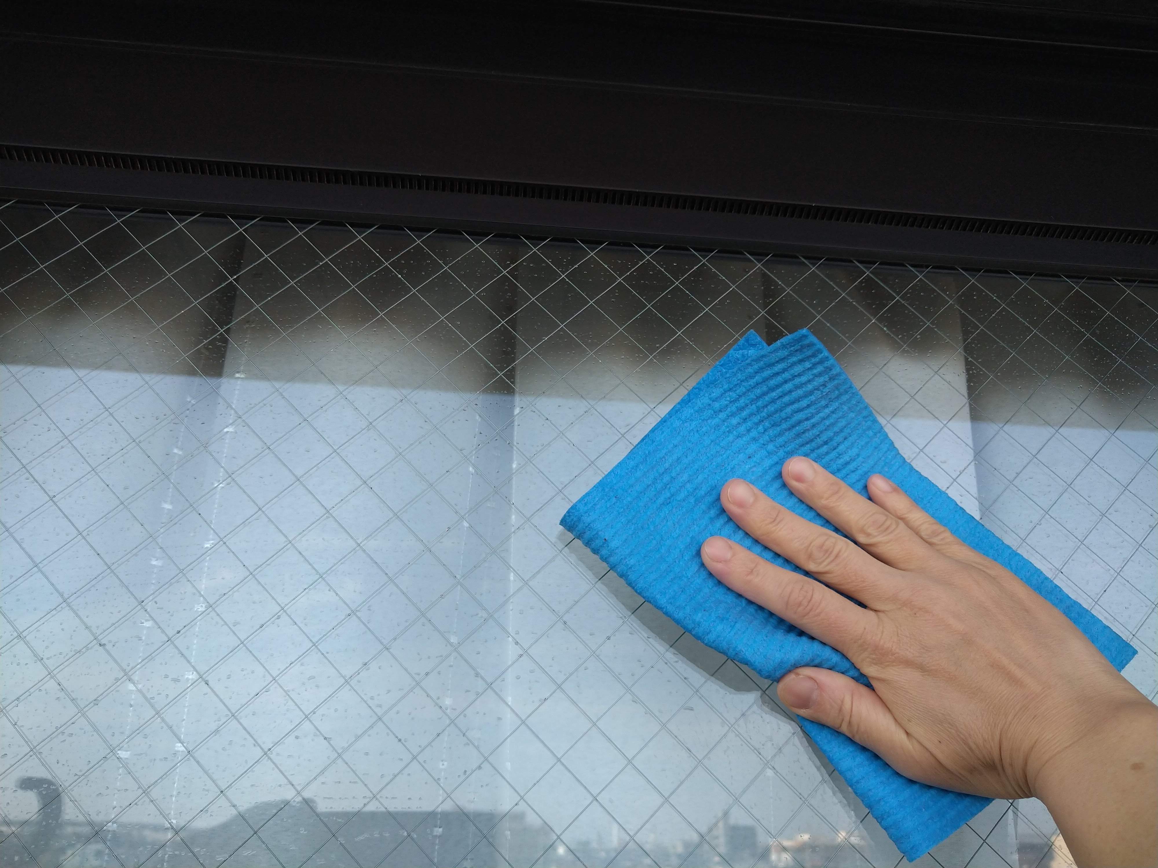 その後、全体をクロスで拭くのではなく、残った水滴を拭きとるようにしましょう。必要以上にクロスを使っては、繊維がガラスに張りつき、仕上がりが美しくありません。