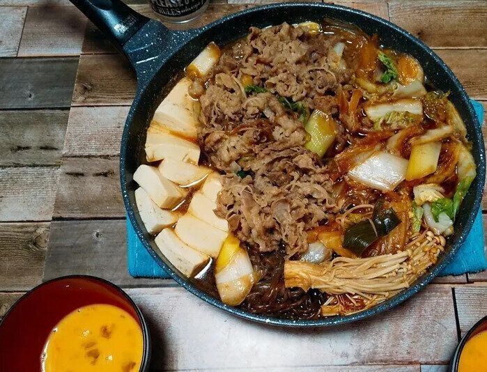 写真は、さちママさんおすすめのすき焼きです。フライパンでつくってそのまま食卓に。あとはごはんを出せばいいだけです。
