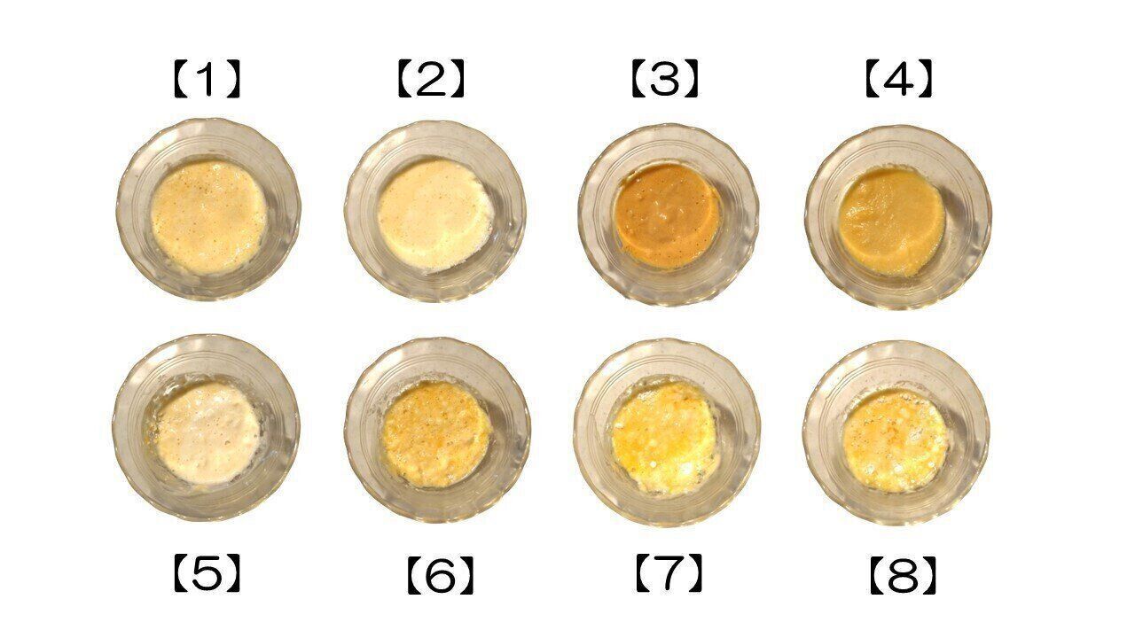 【1】~【4】はベースの種類、【5】はつなぎの種類、【6】はシンプルな組み合わせ、【7】は【6】との比較、【8】はでんぷんの種類について、それぞれ検証してみました。