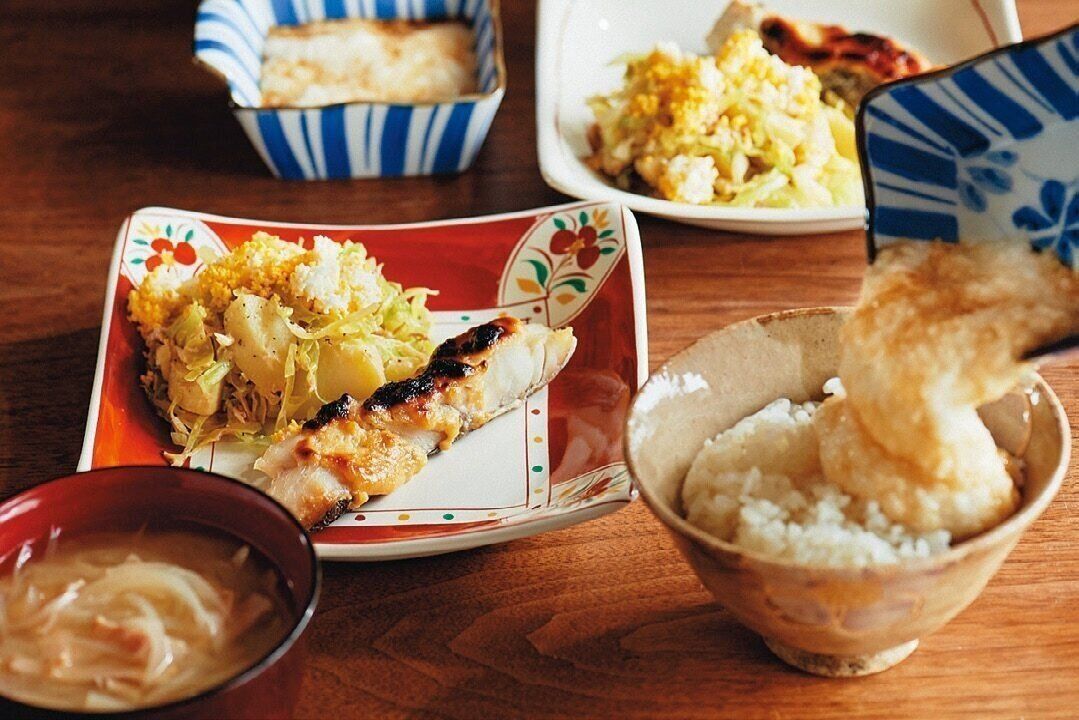 魚献立の日は、冷凍とろろが推し。「土曜日にすりおろして冷凍しておいた長いもを、朝、冷蔵室に入れて解凍し、ご飯にかけるだけで満足感がアップ。物たりないから何かたさなきゃ!と思わなくて済みますよ」。