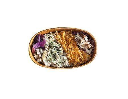 さばのそぼろやにんじんしりしりをご飯にのせた、三色弁当。