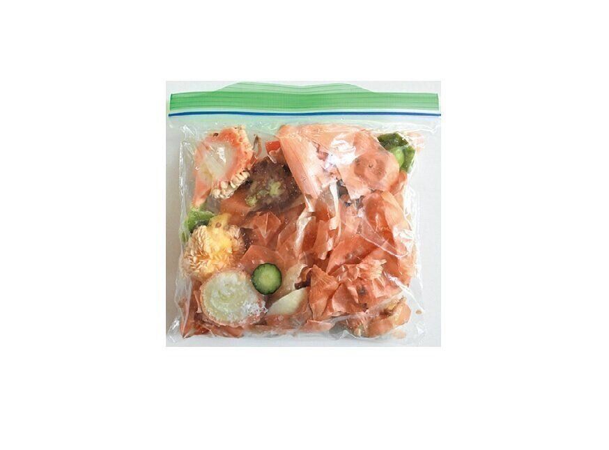料理中にヘタや皮など野菜の切れ端が出る都度冷凍用保存袋にためていき、袋がいっぱいになったら野菜ブロスに。「これでおいしいだしをとりスープやカレーに使ったりしています!」。