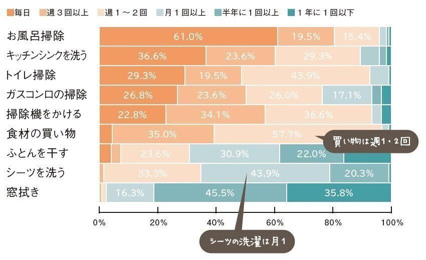 頻度の低い家事ほど、先延ばしにしがちな傾向が。でも、結局やれてないのなら「やらなくちゃ」とプレッシャーを感じるのはソン!窓拭きは年1回、シーツ洗いは月1回など、今できている回数でOKを出しちゃってもいいのかも。