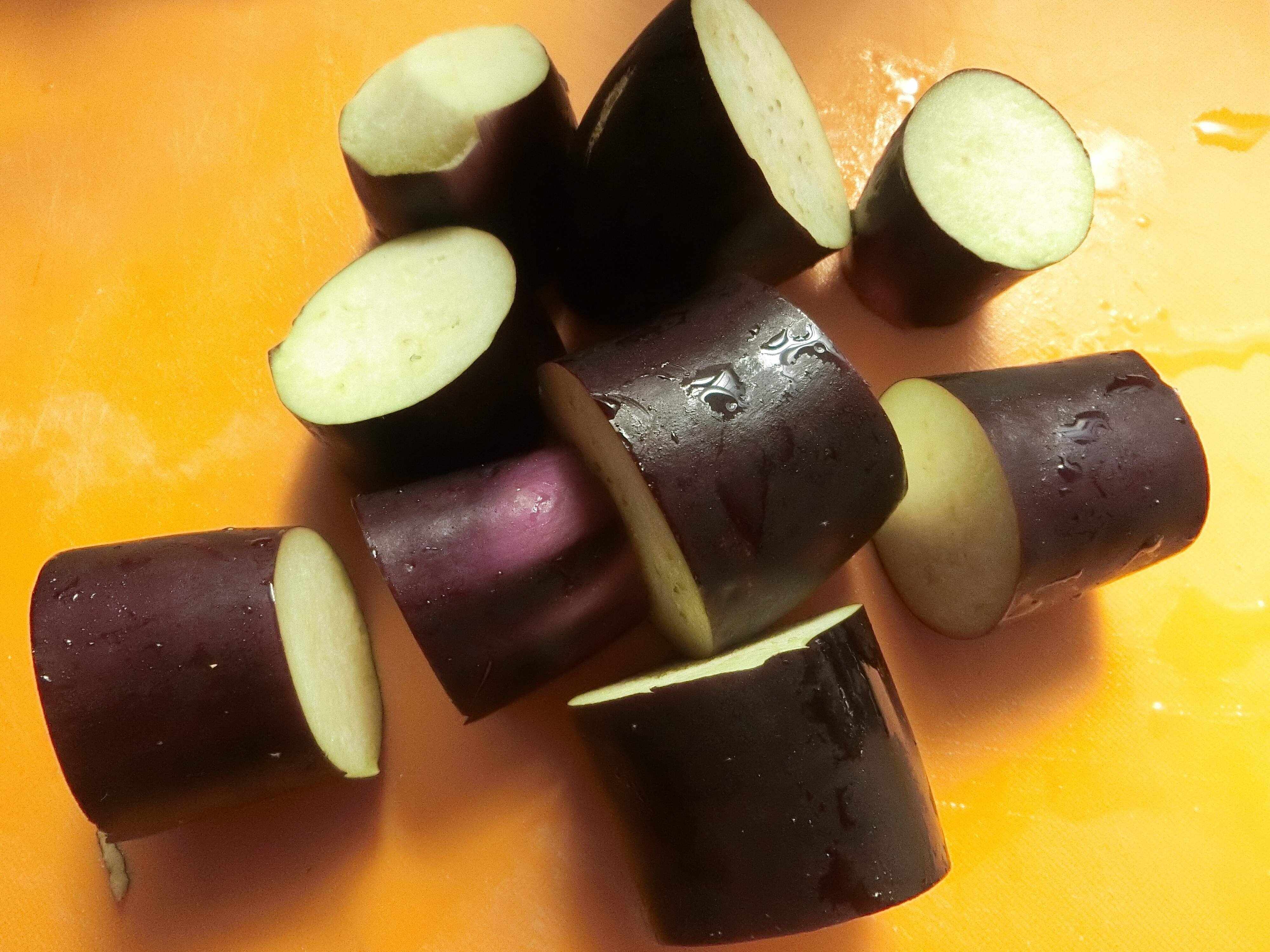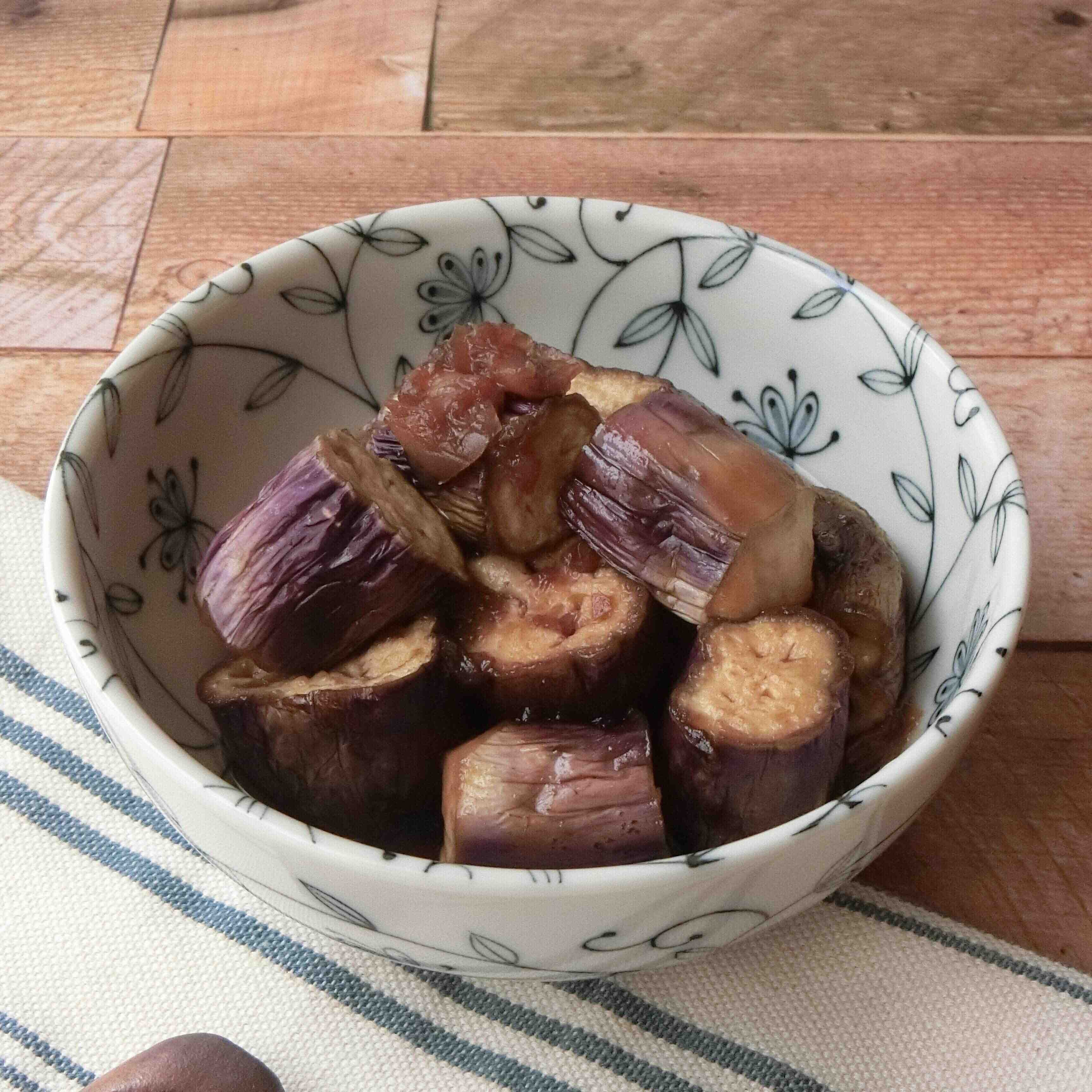 【1】梅干しは種を取って細かく叩いておきます。ナスはへたを落とし、3cm幅くらいに切ります。