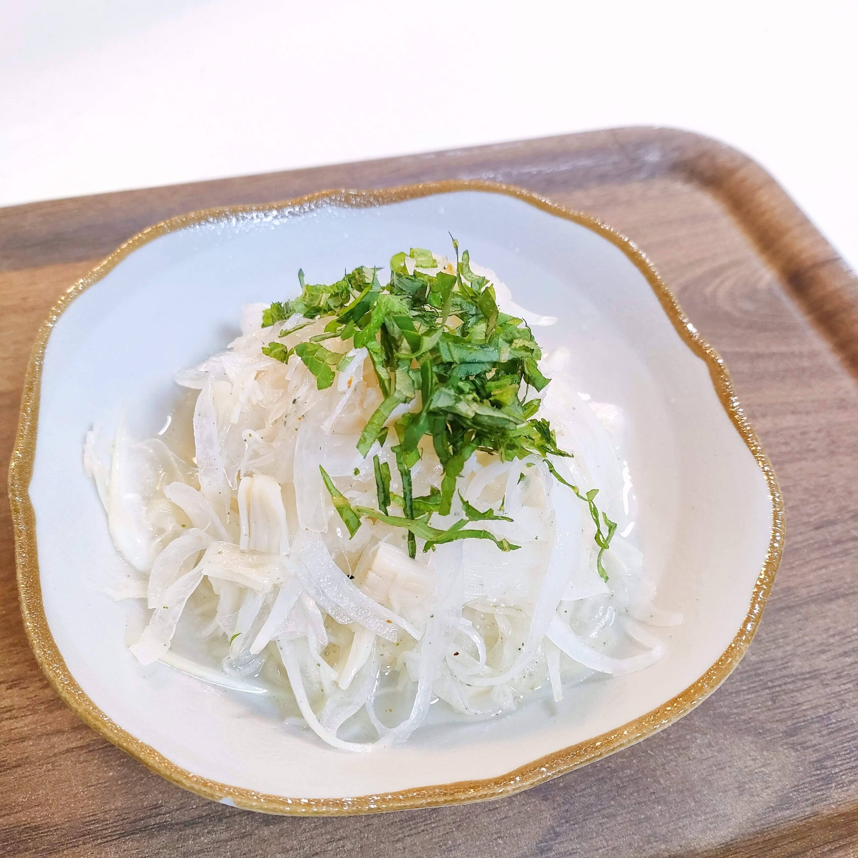 スーパーに売っているホタテの缶詰を使ったおつまみ玉ねぎサラダです。上記と同じようにスライスした玉ねぎにホタテ缶を汁ごと投入して混ぜます。大葉は千切りしておき、混ぜた玉ねぎをお皿に盛りつけたあとに大葉を散らせば完成!