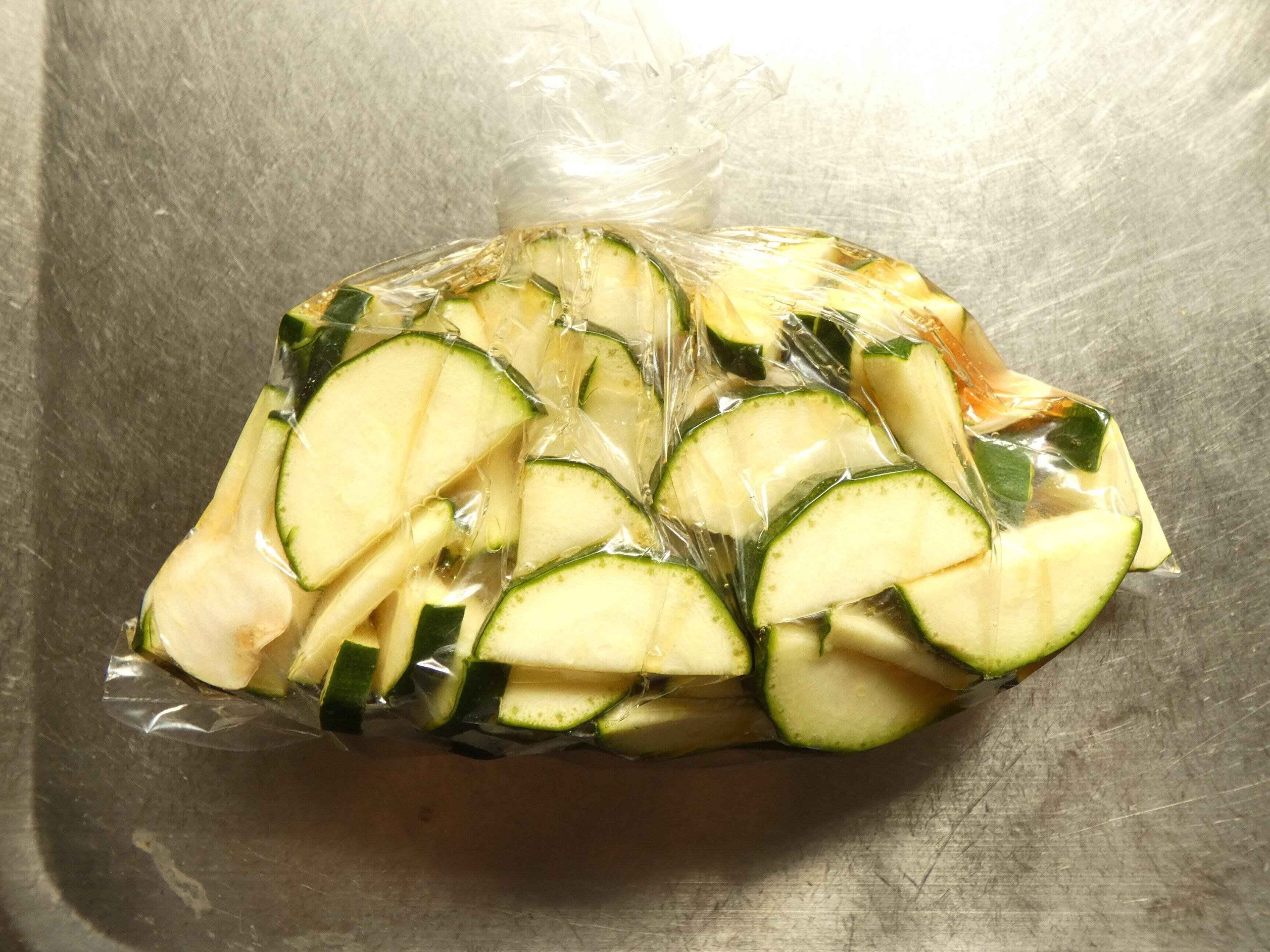 ポリ袋に入れてしっかり空気を抜くと、調味料が少なくても全体に味が行きわたるのでしっかり漬けることができます。