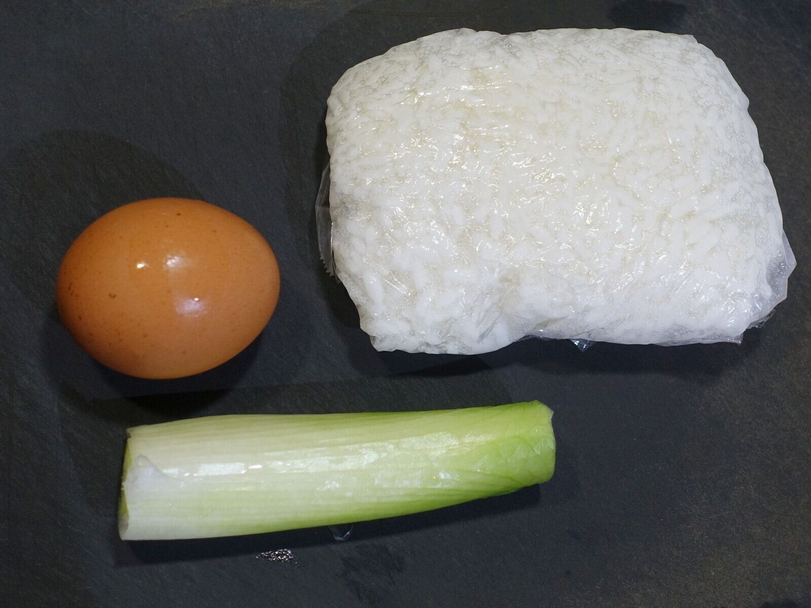 「チャーハン」の具材は何を入れてもかまいません。しかし今回はシンプルなおいしさをわかってもらうために卵、冷凍のご飯茶碗1杯分、ネギだけを使いました。冷凍ご飯は電子レンジで温めて、ネギは刻んでおきます。