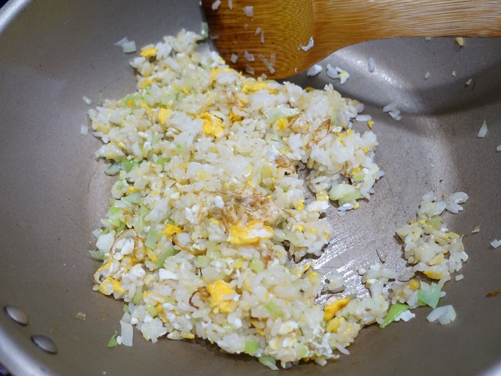 目玉焼きを切るようによく混ぜながら炒めます。中火でよく炒めてください。町中華では火力があるので炒める時間は短くていいのですが、一般家庭では火力がないぶん長く炒めます。ポイントとしては焦げる一歩手前まで炒めます。フライパンを煽る必要はありません。木べらなどでよく混ぜながら炒めてください。