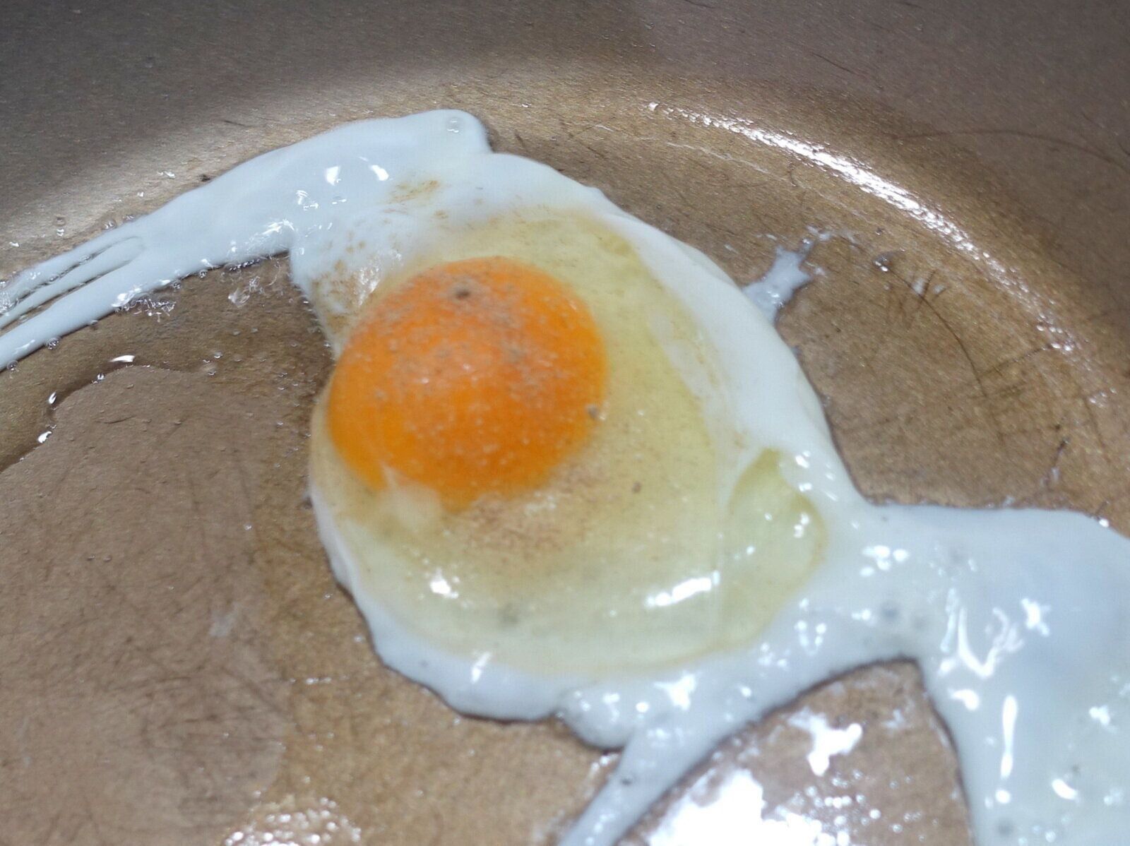 溶き卵ではなく目玉焼きから始めると黄身と白身の旨味が両方味わえると冒頭に書きましたが、火のとおし具合によっては、少し焦げた白身やほとんど生の黄身などいろいろな状態になるほうがおいしくなります。ですから、あまりきっちりと目玉焼きをつくろうとせず、ある程度テキトーにつくるのもポイントと言えるかもしれません。