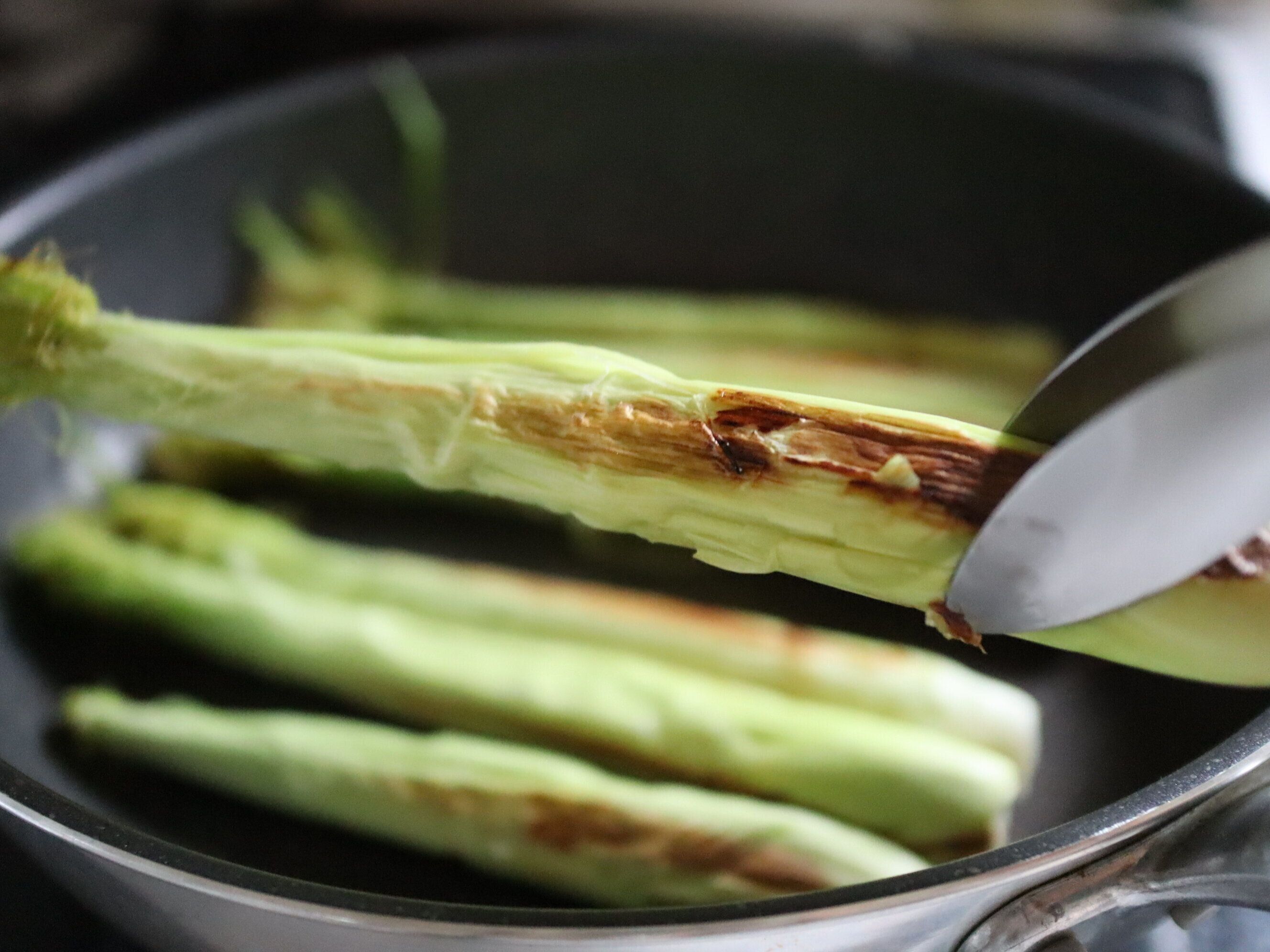 フライパンに丸ごと入れて加熱をすると、中は蒸し焼きに。仕上げにバター醤油をかけて、香り高く仕上げます。