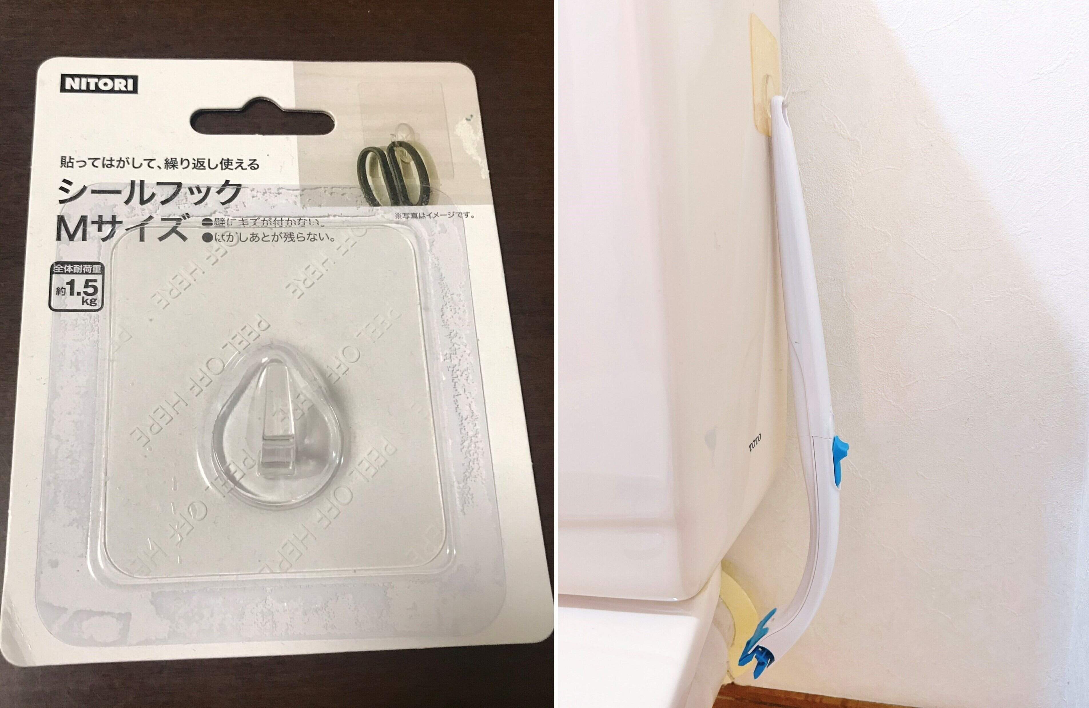 また、収納する際にニトリの「シールフック」などを使って、ハンドルをタンク部分に吊るして収納すると床の拭き掃除が劇的に楽になりますよ。
