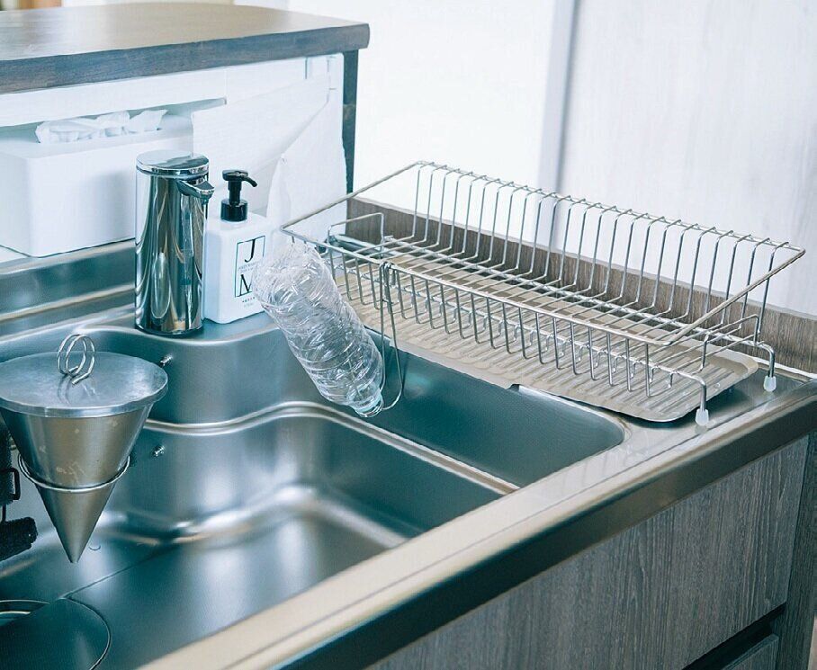 シンク回りのキッチングッズはプラスチック製ではなくステンレス製の物を使用。「ステンレスのほうがプラスチックよりヌメリやカビがつきにくい気がするし、手入れが簡単&見た目もスッキリ」。