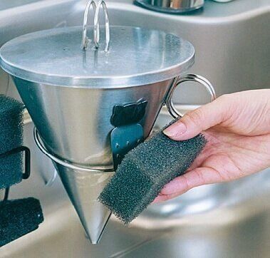 三角コーナーは置かず、ステンレス製のポットをシンクのフチに引っかけ。円すい形の下から水が切れ、フタつきでにおいを防止。「持ち手を持って中身をゴミ箱にポイ。手が汚れません」。