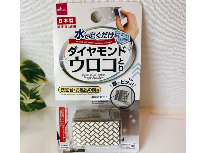 100円均一のダイソーで人気商品のダイヤモンド ウロコとり。浴室の鏡にはすぐウロコ汚れがつきますよね。そのウロコをキレイにしてくれる道具です。