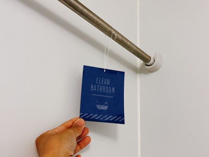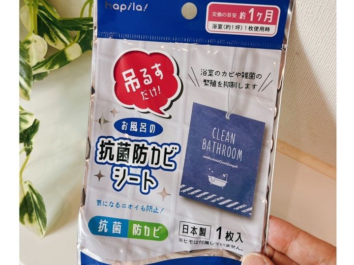 ダイソー商品でカビ予防ができるのが、防菌防カビシート。お風呂内に吊るすだけで防カビになるなら試してみたいですよね。家にある紐をシートに通して、吊るすだけ。