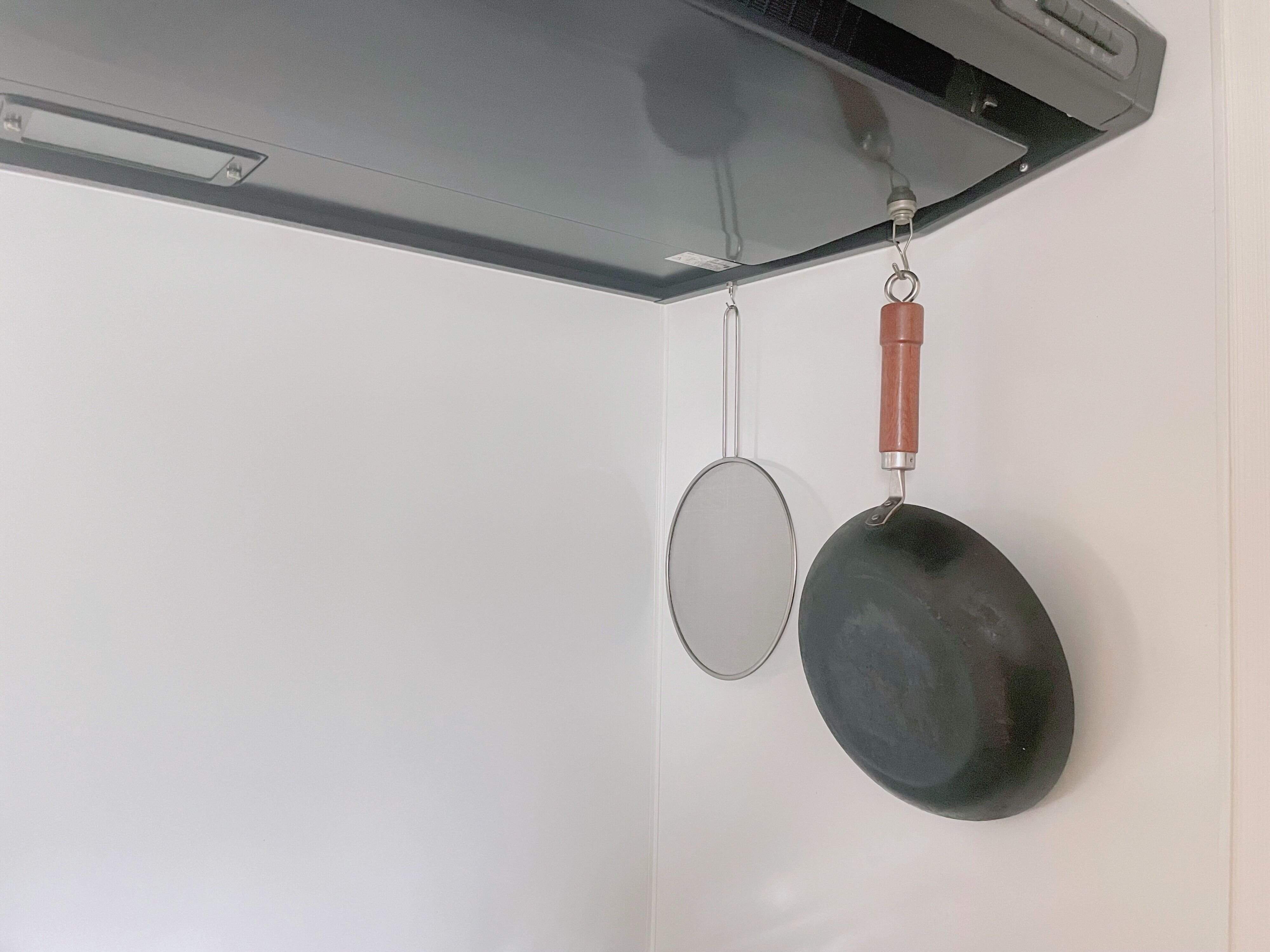 吊り下げられるフライパンや油はね防止ネットは、強力マグネットを使用して、吊り下げ収納にするのがオススメです。