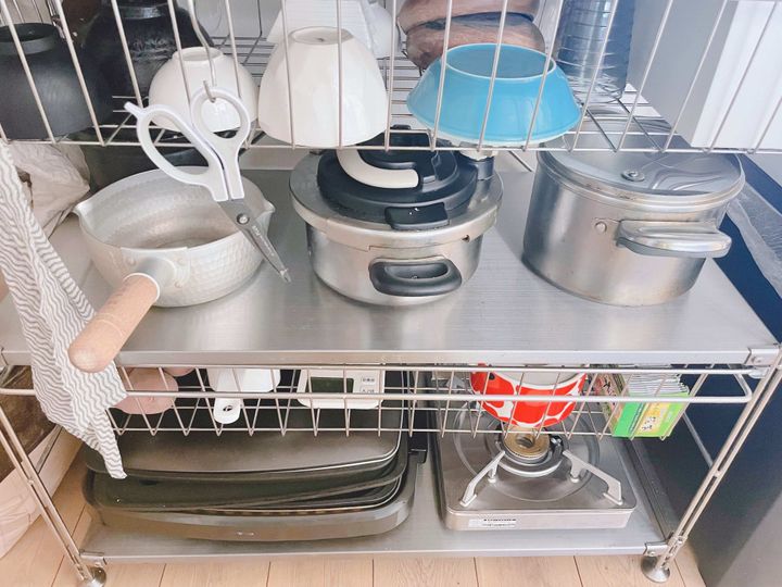 毎日使う鍋は、出し入れしやすいのが1番!扉タイプは出し入れが面倒なので、オープン収納かつコンロ周辺に置くのがベストです。