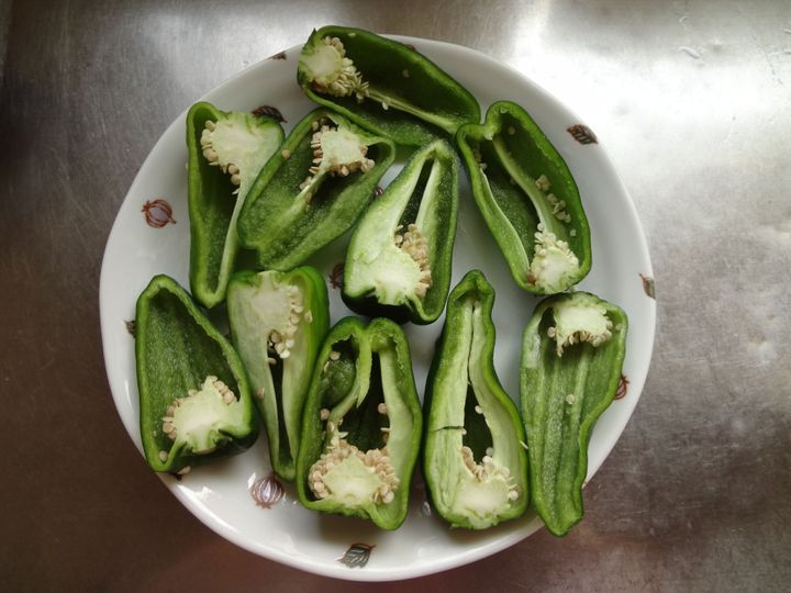 1.ピーマンは洗ったら種ごと半分に切ります。