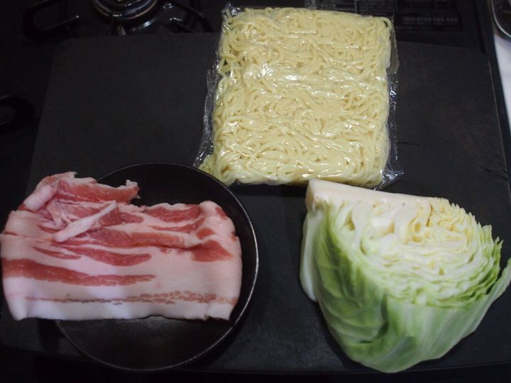 具材が多い焼きそばもいいですが、屋台の焼きそばは具材をシンプルにしているところが多いですね。このレシピの目的は“屋台らしさ”の再現ですから、用意するのは麺、豚バラ肉、キャベツのみでOK。