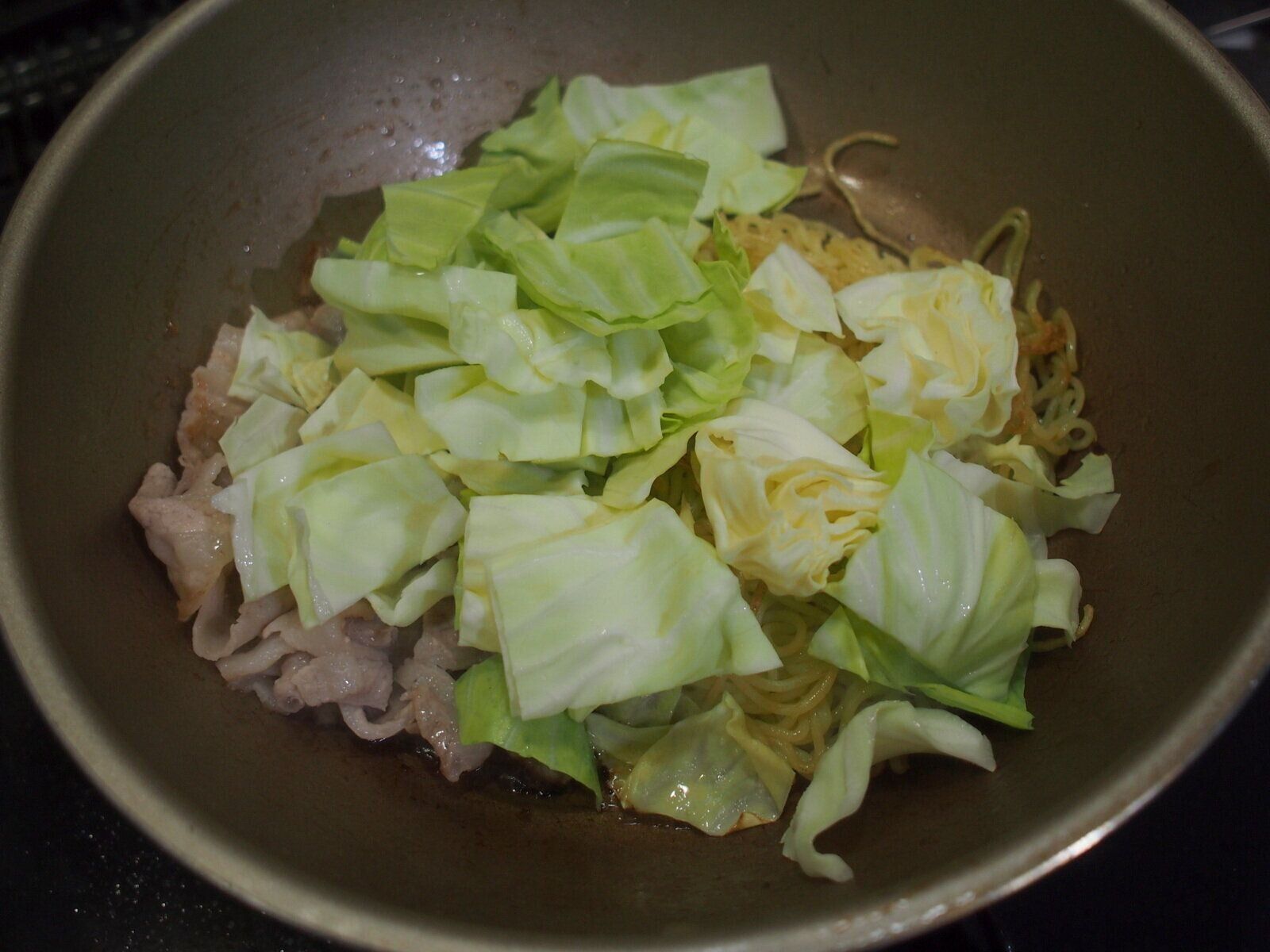 豚バラ肉に火が通り、麺に焼き色がついたら、キャベツと水を50ccほど入れて、麺をほぐします。キャベツがしんなりしてきたら、ウスターソースか中濃ソースを入れます。