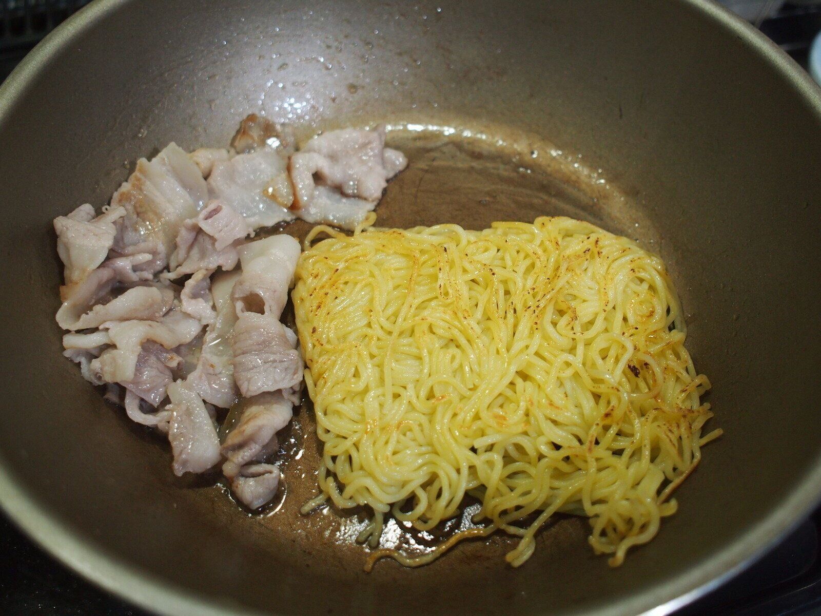 まずは、油を大さじ1ほど入れて、豚バラ肉と麺を入れます。麺はほぐさなくてもいいです。そのまま焼き色がつくまでこんがり焼くのがポイント。