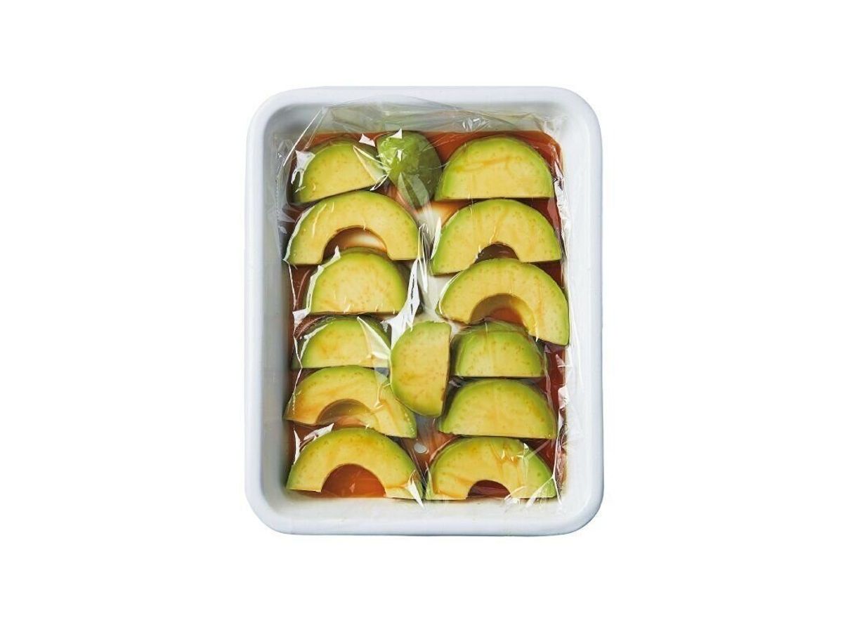 アボカド1個は厚さ1cmに切ってバットに並べ、めんつゆ大さじ1をからめてぴったりと落としラップをする。約2時間後から食べられるが、一晩漬けたほうがねっとりしておいしい。ご飯にのせても。