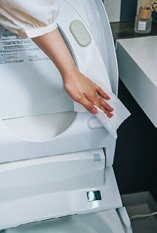 洗濯前の乾いてる状態で上部をお掃除シートでサッとほこり取り。「洗濯槽がなんかにおうと感じたら塩素系漂白剤で、4カ月に1回は酸素系漂白剤で洗濯槽の裏の汚れを取ります」。