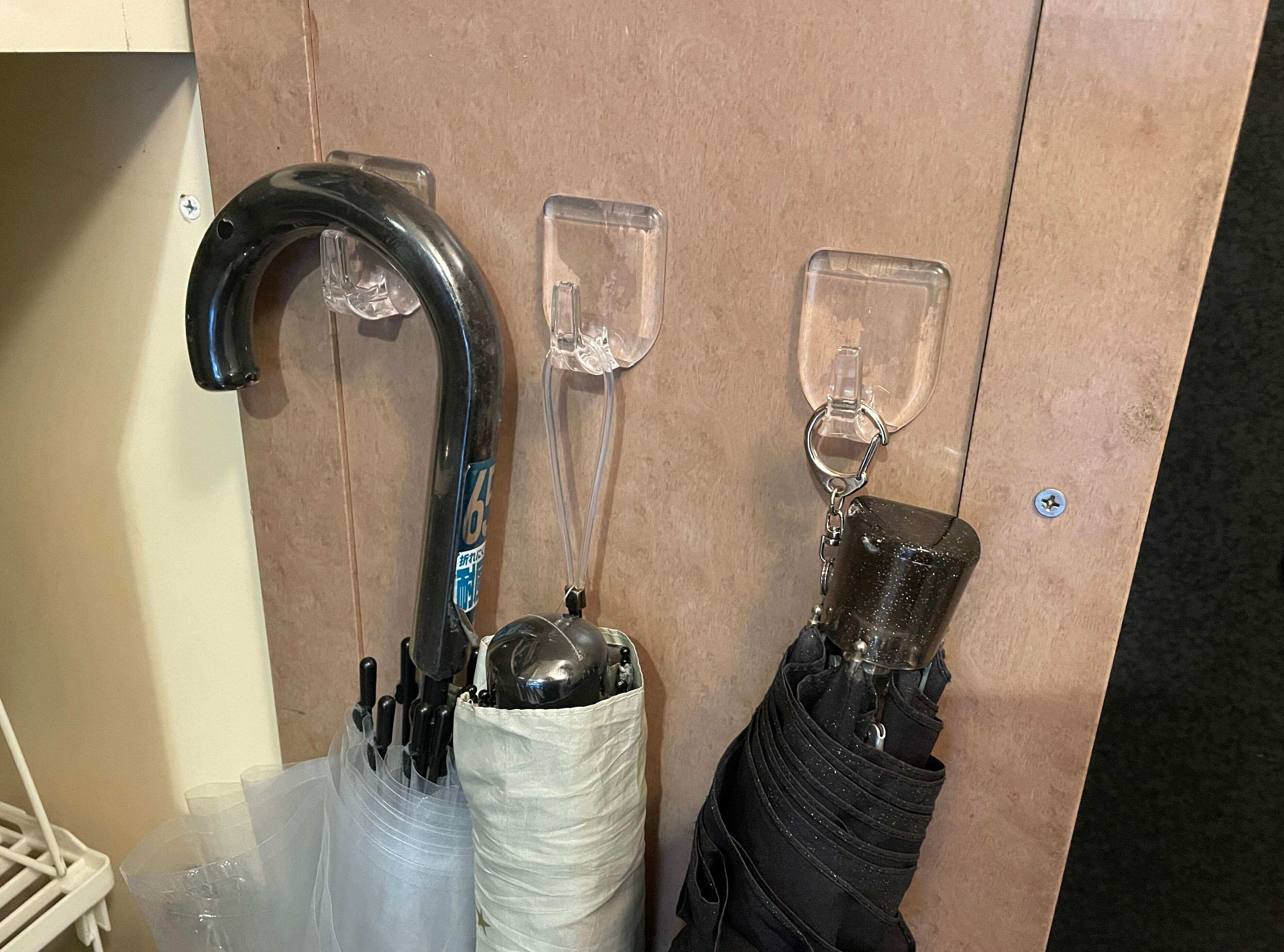 粘着式のフックを使用すれば、下駄箱や玄関に傘を掛けることも可能です。下駄箱の内側にフックを取り付け傘を掛ければ、扉を閉めると普段は傘が見えずにすっきりしますよね。貼ってはがせるフックを使えば、位置の修正も可能ですよ。