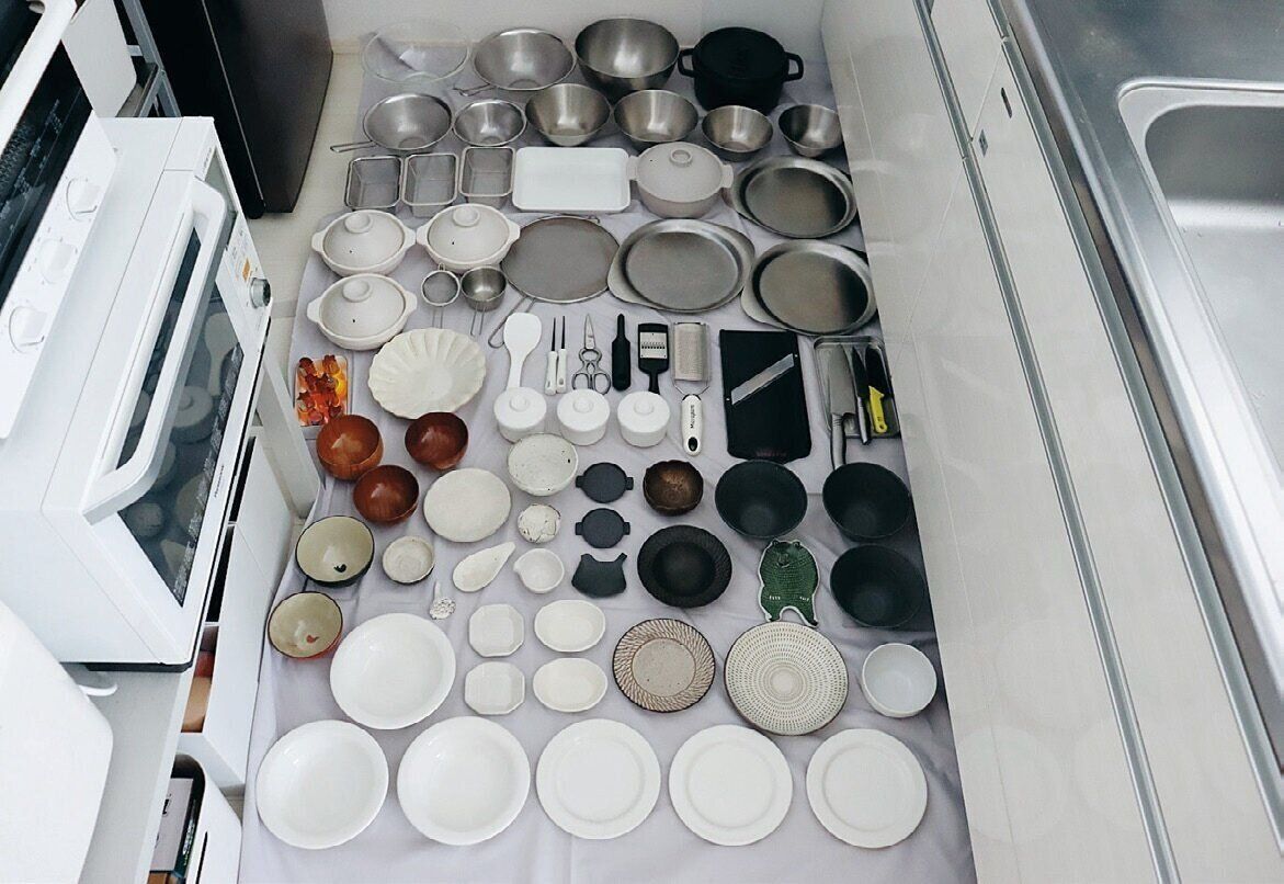 ボウルやざるなどの調理器具に加え、家族3人分の1人用土鍋や茶わん蒸し器など、おうちごはんを充実させる食器がズラリ!「無印良品のシンプルな白い食器は、和洋中どんな料理にもマッチ。料理を引き立ててくれる食器をチョイスすることで食卓の満足度が高くなり、食費のセーブにもつながっています」。