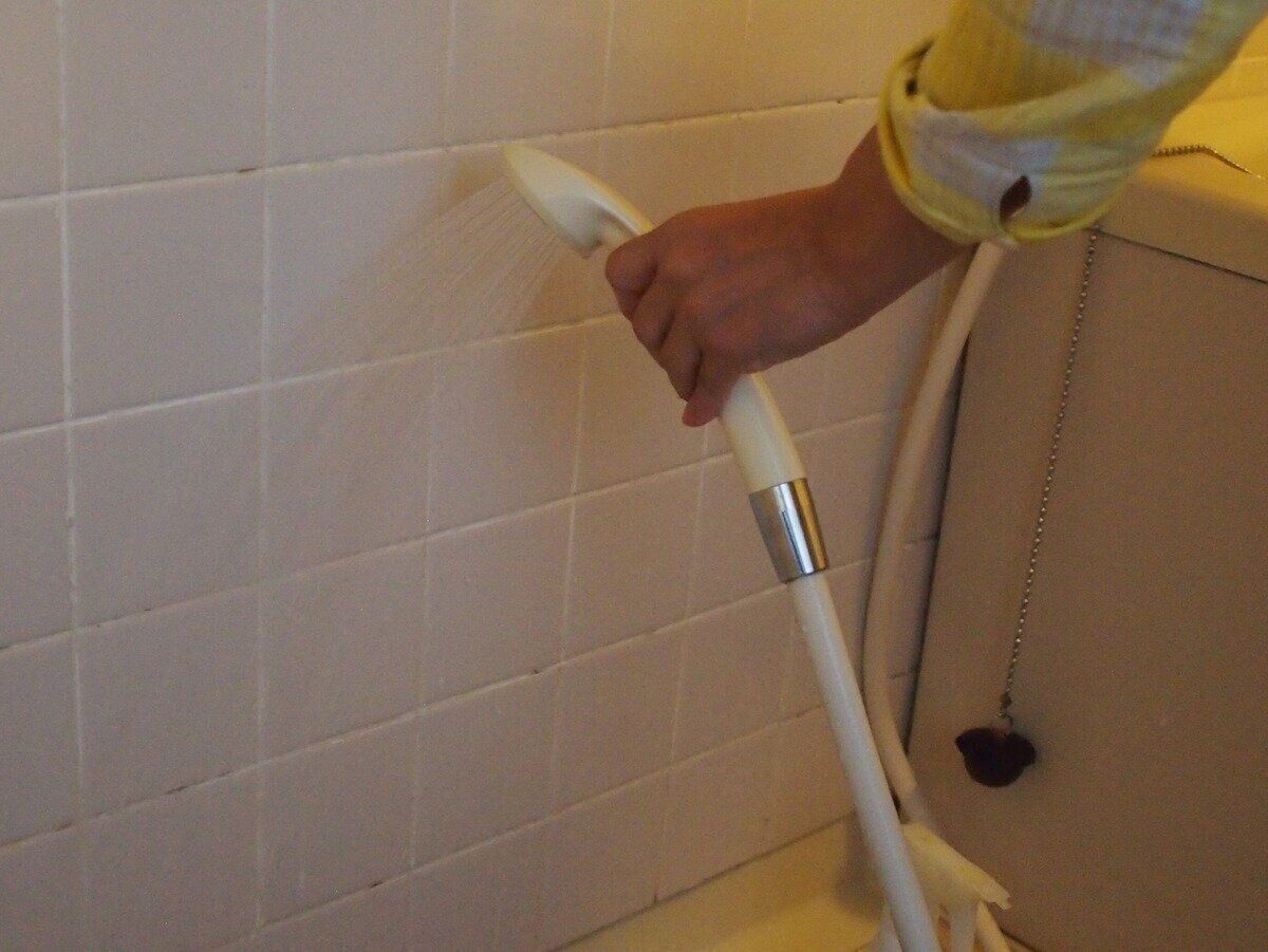 浴室の掃除の手順を紹介しましょう。まずは、換気をすること。浴室全体に水をかけてざっと洗います。水を流すのは高いところから低いところ。天井から壁、床へ水を流します。