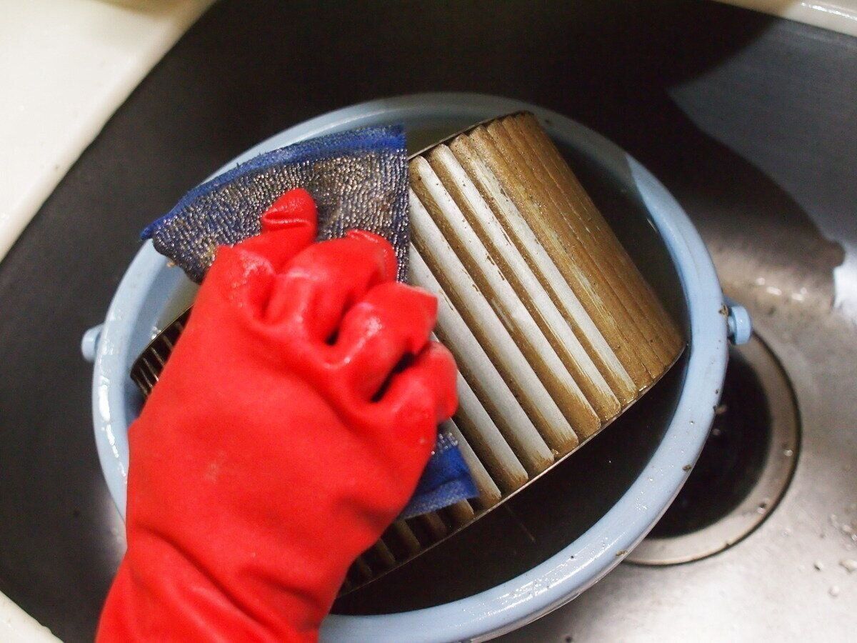 掃除の仕方ですが、外してすぐにゴシゴシ洗うのはNG。効率よく掃除するには、まず、アルカリ性の洗剤を入れたお湯に浸してしばらく置きます。こうしておけばだいたいの汚れは落ちています。それからこびりついている汚れなどを取って、水洗いします。