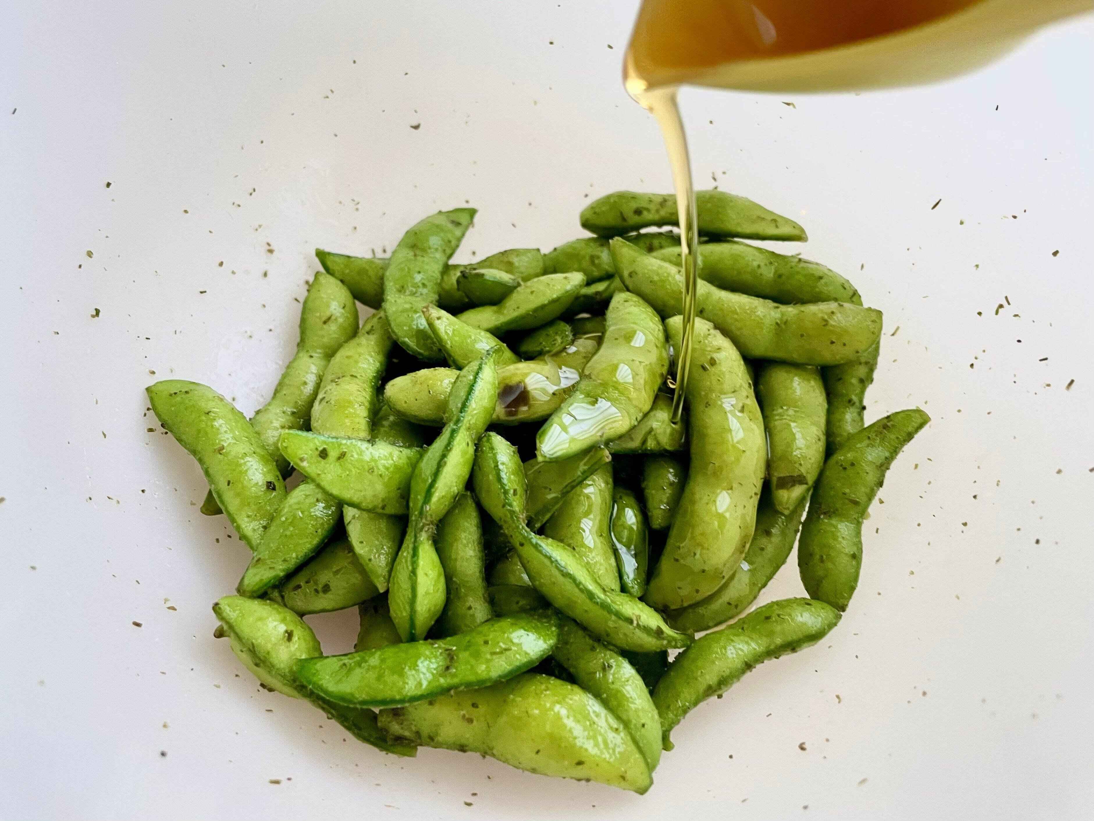 (1) 枝豆はサッと水洗いしたら、塩と黒こしょうを揉み込む。
