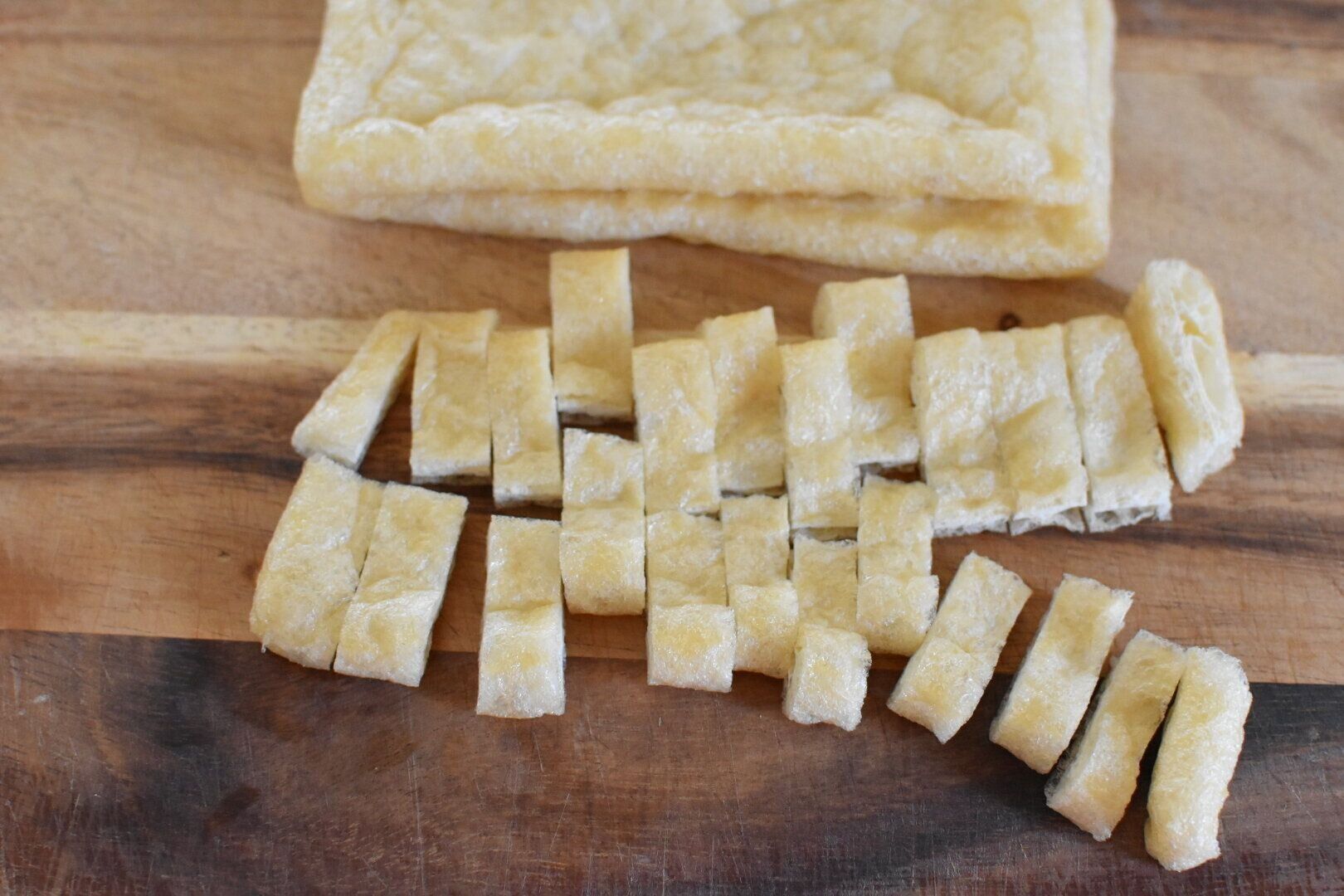 または、“油揚げ”とも呼ばれています。地域によって名称が異なるようですが、どちらも豆腐を薄く切り、水分を抜いてから油で揚げたものです。ここでは、”うす揚げ”と呼ばせていただきますね。