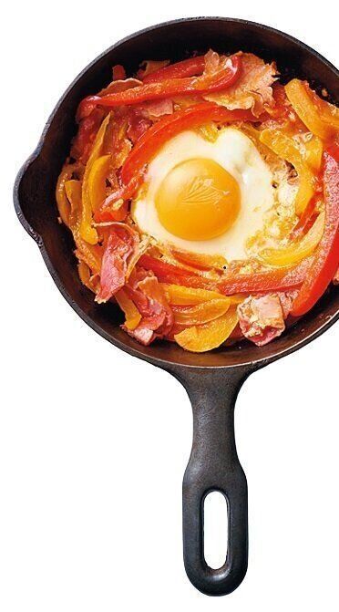 (2)生ハム6枚を手でちぎって加え、さっと炒める。塩少々で調味し、卵1~2個を落として好みの硬さになるまで火を通す。