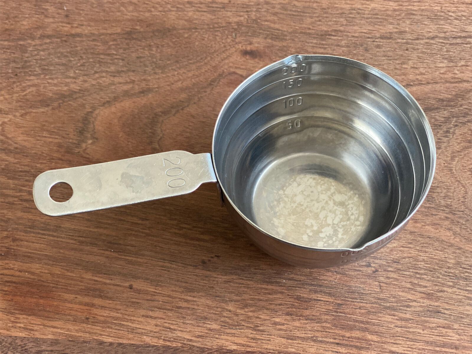 計量カップの分量は、1カップ=200mlです。おもに液体の計量に使われますが、小麦粉やパン粉など粉末を多く使うときにも使われます。