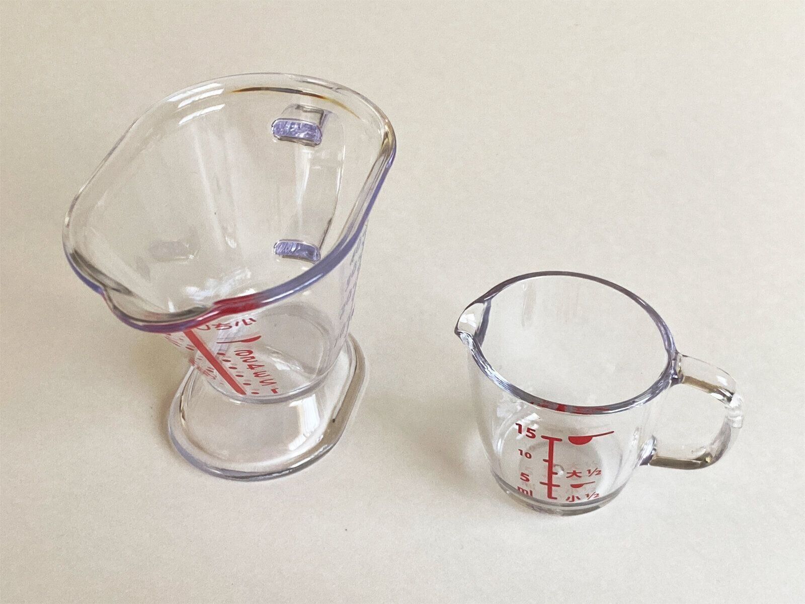 写真にある小さいものは「大さじ1」「15ml」まで、やや大きいものは「大さじ3」「50ml」まで計量できます。真上から目盛りが見えて、置いたまま使えるので、液体はこぼしにくいというメリットもあります。