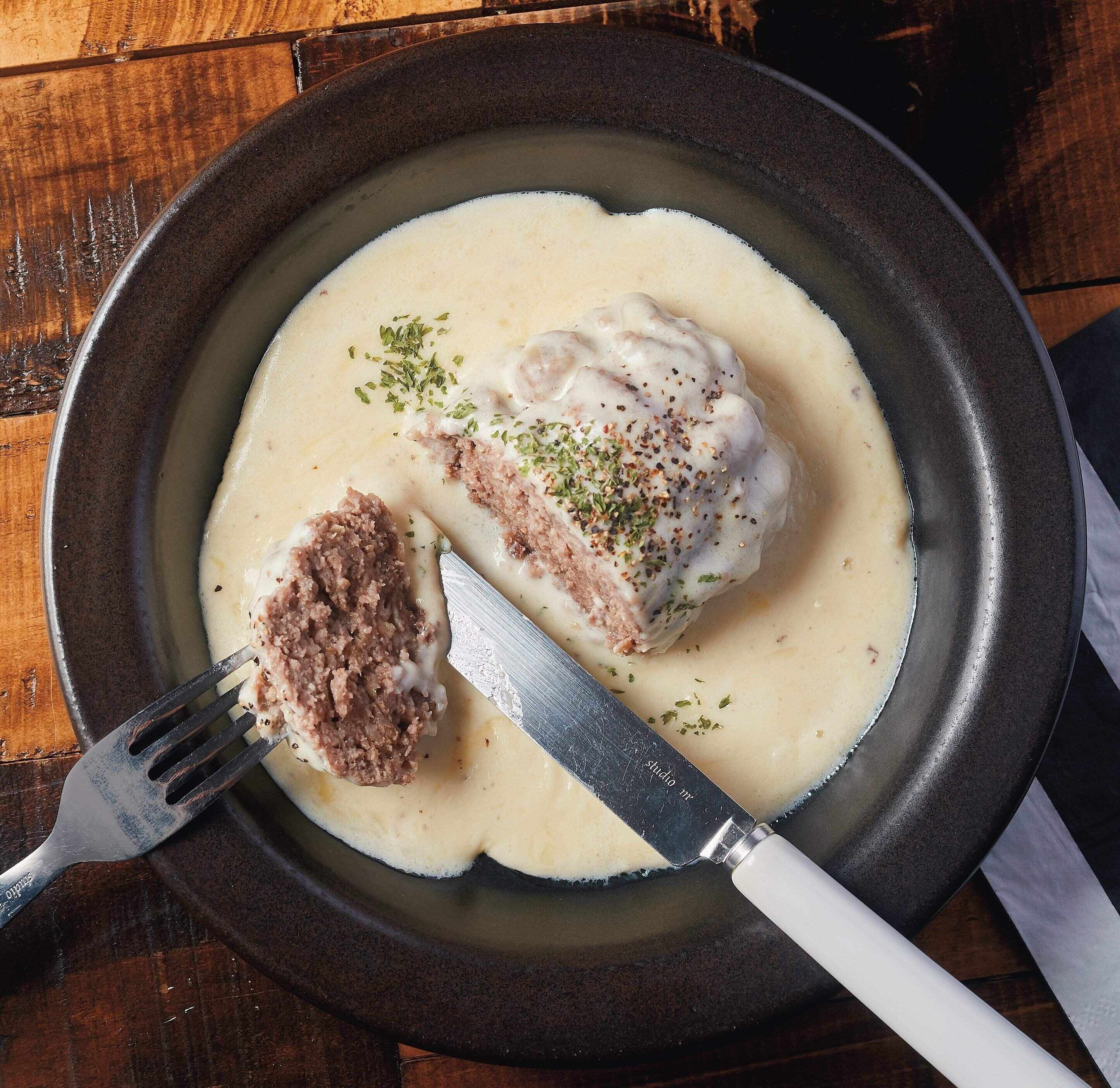 ハンバーグだけを取り出し、容器にピザ用チーズを加える。ふんわりとラップを掛けて、電子レンジで1分加熱してソースを作る。熱いうちにハンバーグの上にかけ、好みで黒こしょう、ドライパセリをふる。